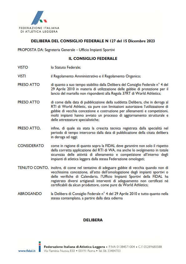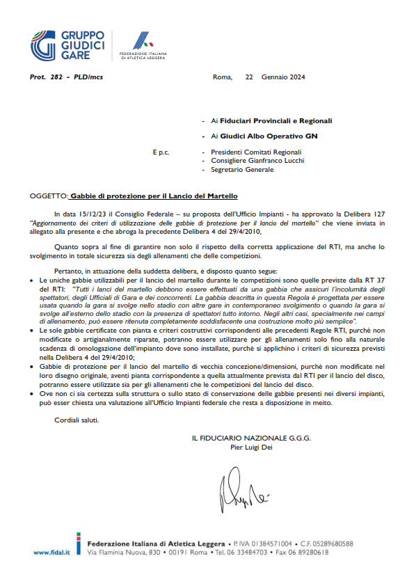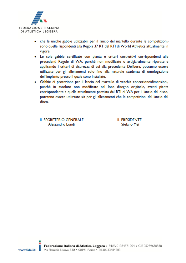 “Aggiornamento dei criteri di utilizzazione delle gabbie di protezione per il lancio del martello”
