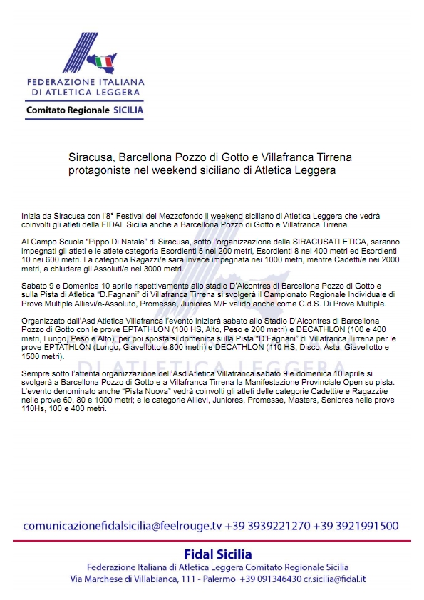 2° Weekend di Aprile l'atletica in Sicilia 09 Aprile 2022 Condividi con Tweet Seguici su: Pagine correlate