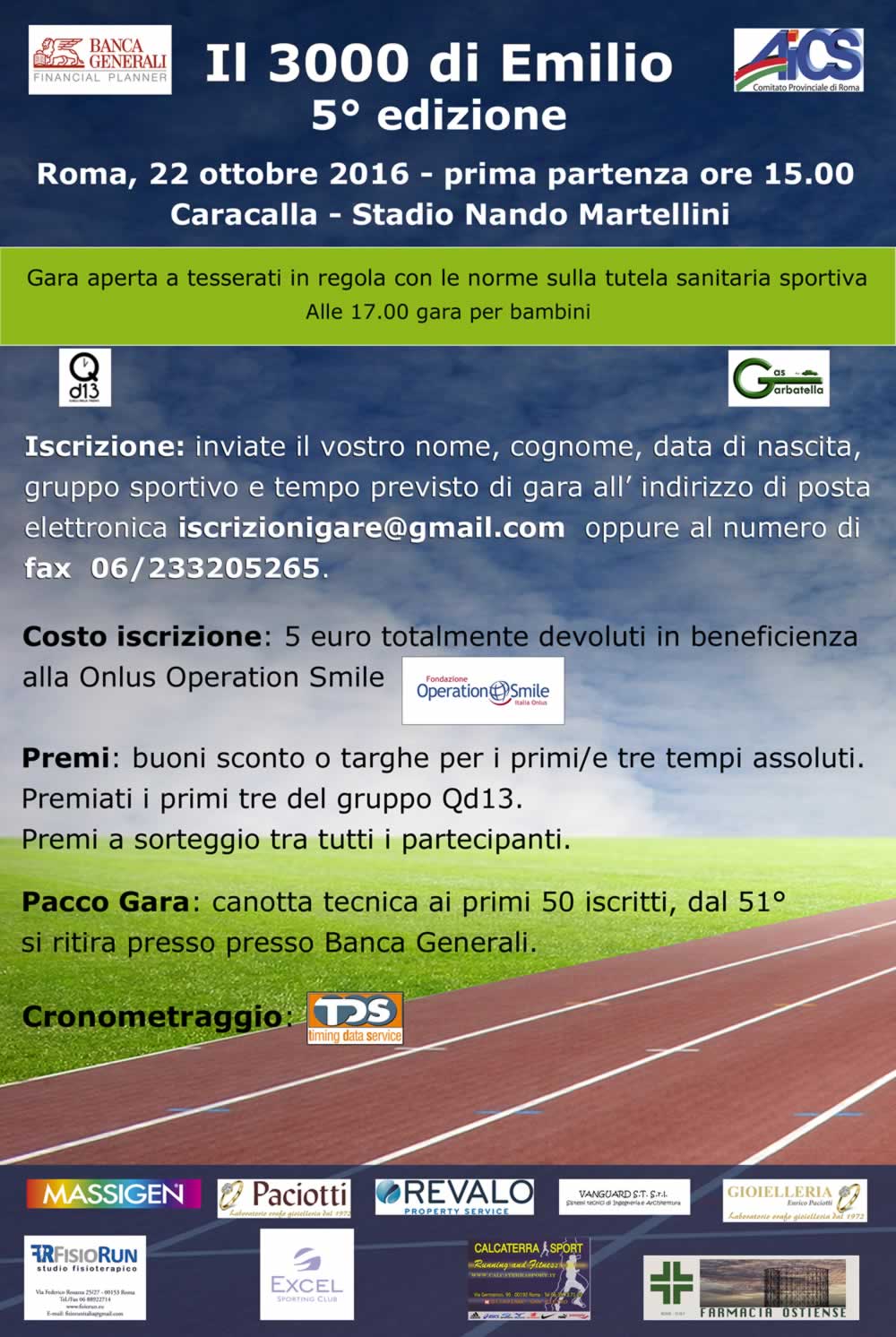 Il costo dell’iscrizione, totalmente devoluto alla Onlus Operation Smile, è di 5 Euro (pacco gara con canotta tecnica per i primi 50 iscritti), da effettuarsi con mail a iscrizionegara@gmail.com oppure contattando il numero 06233205265, comunicando nome, cognome, data di nascita, gruppo sportivo e tempo previsto di gara (iscrizioni sul posto per le ultime due serie). I premi consisteranno in buoni sconto o targhe per i primi/e tre tempi assoluti, oltre a premi per i primi tre del gruppo Qd13 e a sorteggio tra tutti i partecipanti.