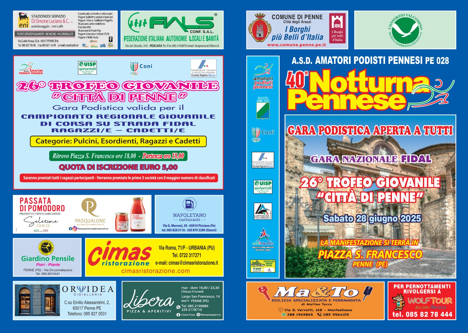 Nella stessa manifestazione ne è inserita un’altra, il Trofeo Giovanile Città di Penne, valevole come Campionato Regionale su Strada per le categorie Cadetti (under 16) e Ragazzi (under 14). Le gare partiranno alle ore 19.00. Iscrizioni entro le ore 24 di giovedì 26 giugno dal sito Timingrun. Si prevede la presenza di quasi mille podisti nell’intera manifestazione. Volantino Volantino Programma giovanile Regolamento competitiva