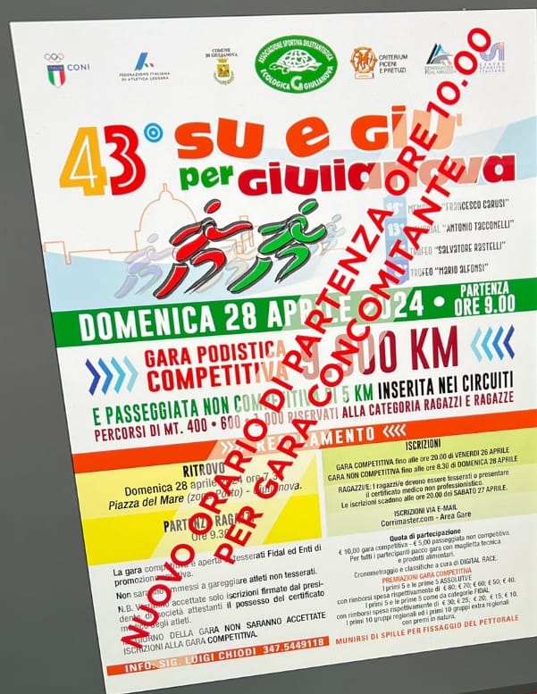 In programma domenica 28 aprile una delle classiche del podismo regionale: la Su e Giù per Giulianova, giunta alla 43^ edizione. Un tempo, gara che si sviluppava anche per le strade collinari, da cui il nome Su e Giù, oggi gara interamente pianeggiante sui 9,9 Km. La partenza è fissata alle ore 10.00 da Piazza del Mare (zona porto). La manifestazione, organizzata dalla società Ecologica Giulianova, è inserita nel calendario Corrimaster. Iscrizioni entro le ore 20.00 di venerdì 26 aprile dall’Area Gare Corrimaster.com La quota è di 10 €. Premi in denaro per i primi 5 classificati assoluti maschili e femminili e per i primi 5 di ogni categoria FIDAL. Locandina
