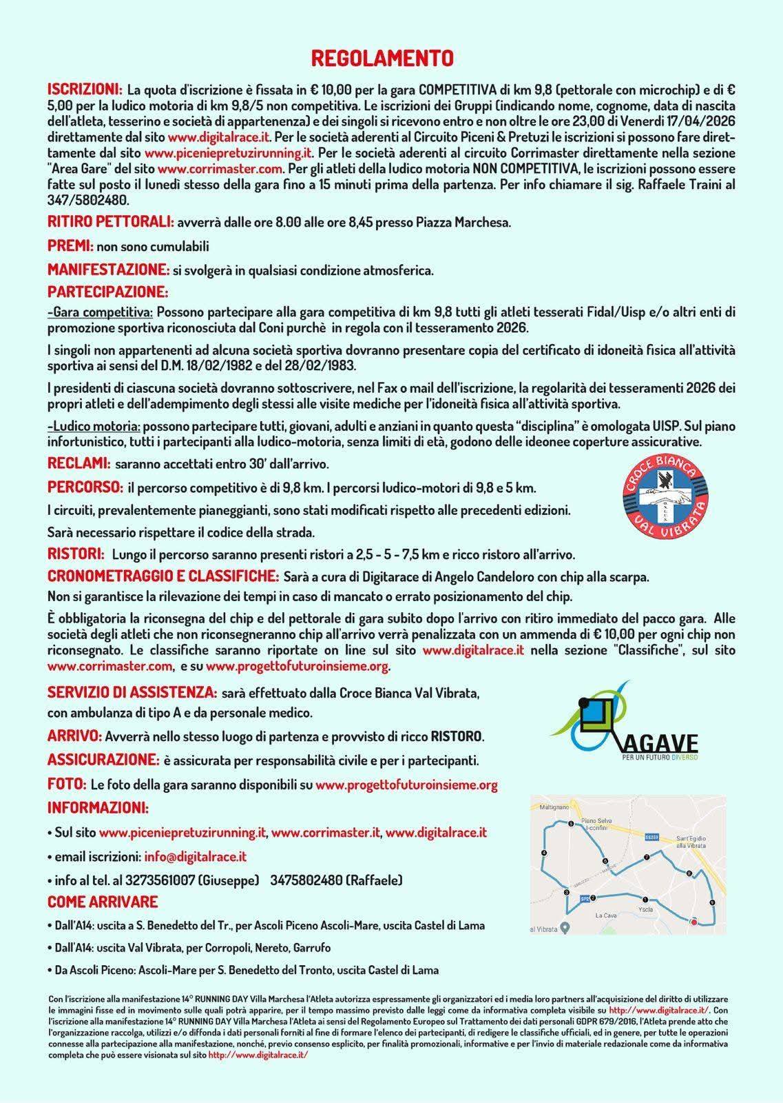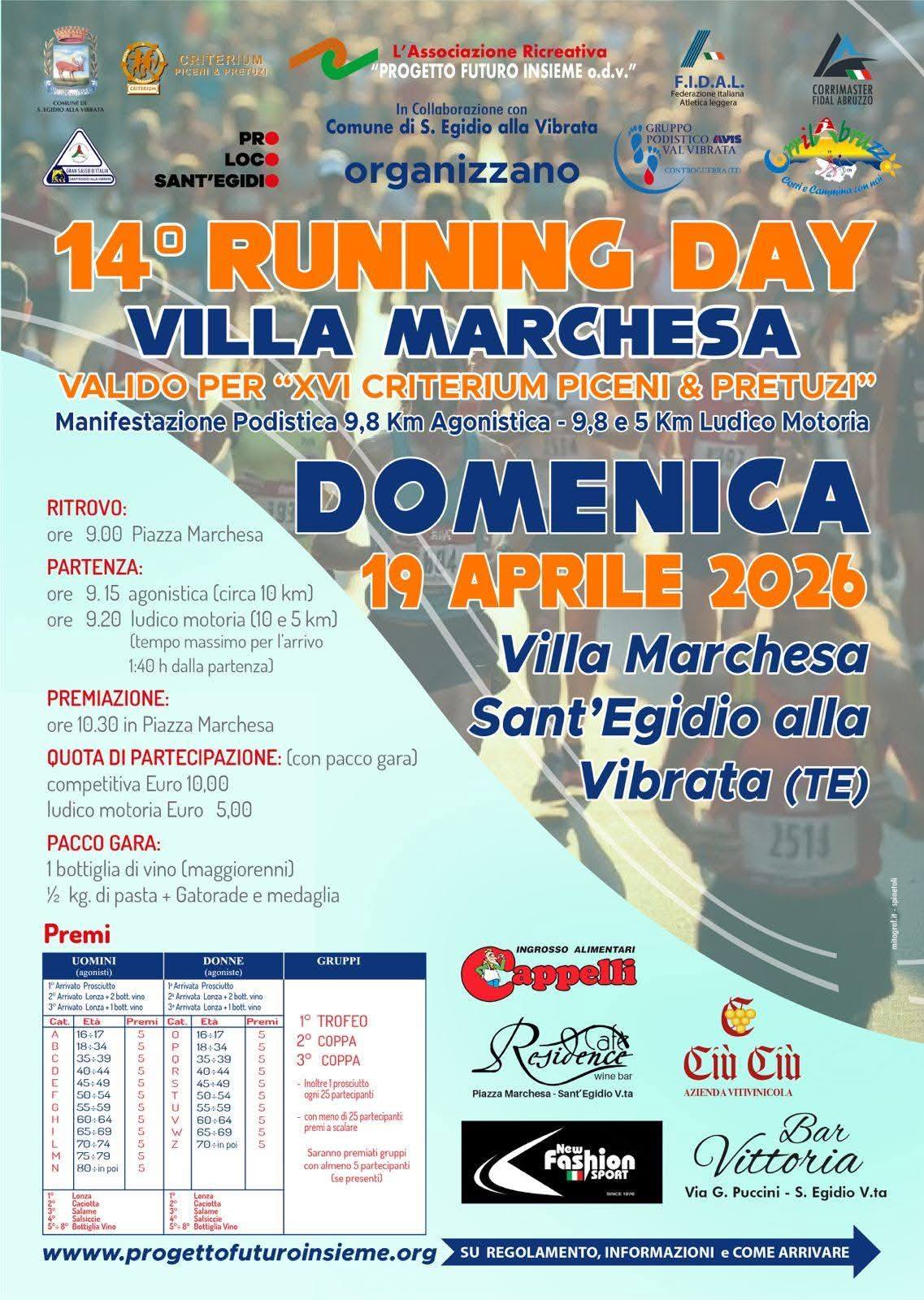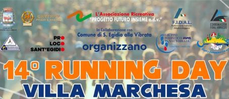 15 Aprile 2026Il calendario podistico propone domenica 19 aprile la 14^ Running Day Villa Marchesa di Km 9,8 a Villa Marchesa di Sant’Egidio alla Vibrata (TE). La gara partirà alle ore 9.15, ritrovo ore 9.00 Piazza Marchesa. L’organizzazione è curata dal Gruppo Podistico Val Vibrata. La quota di iscrizione è di 10 €. Volantino Regolamento