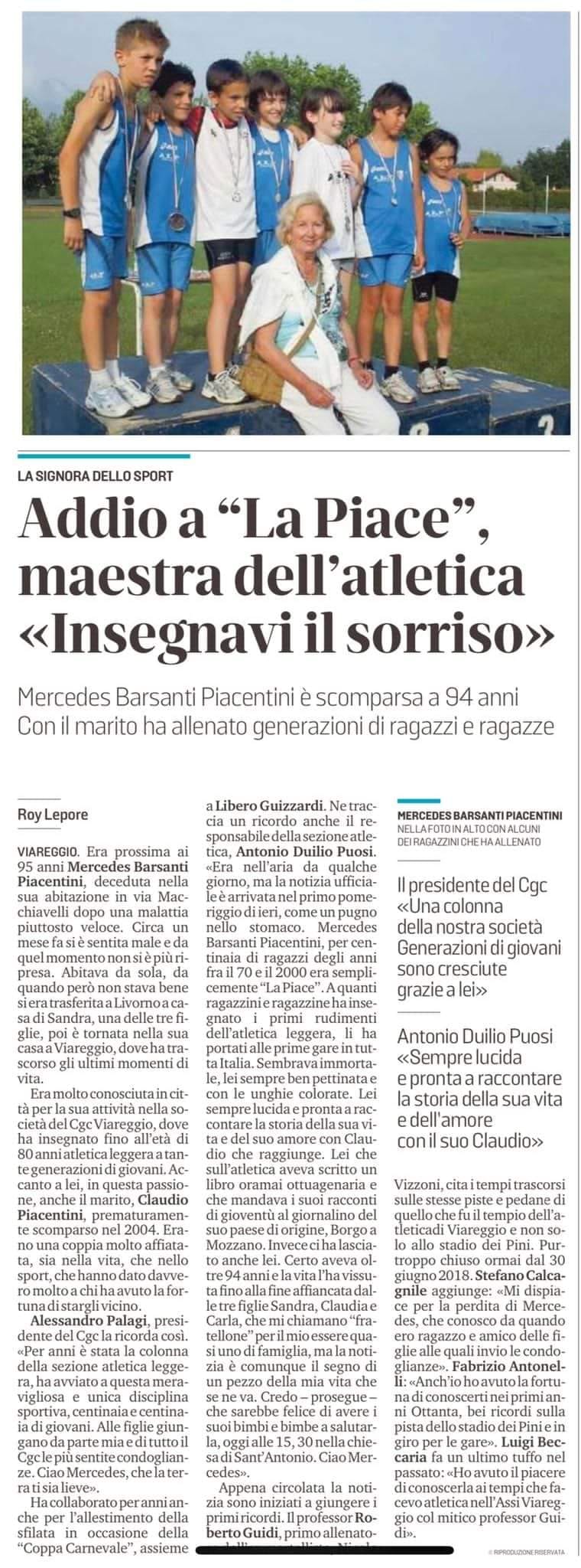 17 Novembre 2021Apprendiamo, con enorme dispiacere, della scomparsa di Mercedes Barsanti Piacentini che ha scritto pagine indelebili di storia dell’atletica leggera di tutto il territorio viareggino (tecnico e anima del CGC Viareggio) e dell’intera provincia di Lucca. Con passione, impegno e serietà, “la Piace” ha saputo interpretare in modo esemplare il ruolo di tecnico e di maestra di vita per i piccoli atleti che ha formato in tantissimi anni di attività.