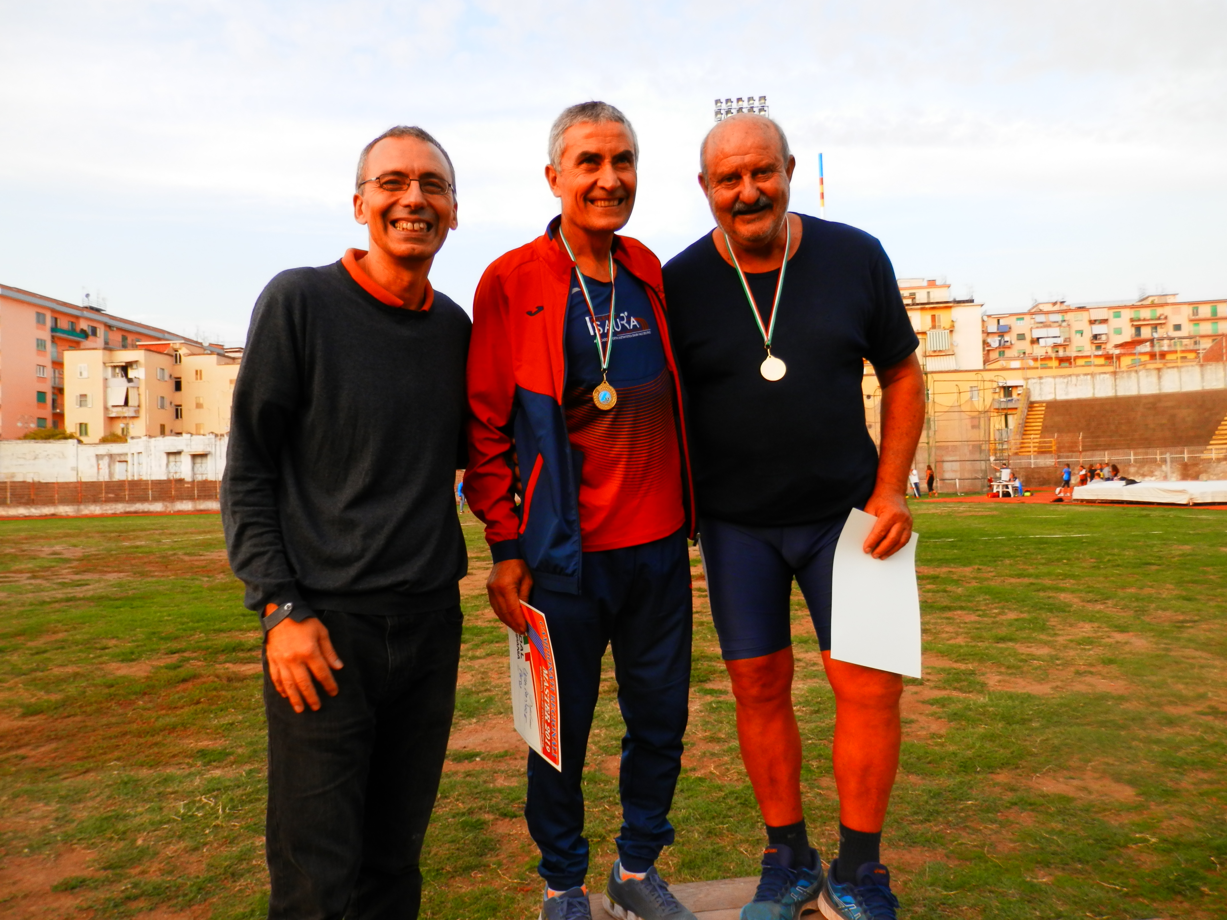 LeggeraBN) nei 100m(13”3);SM65 Silvano Di Salvo(Hippos) nei 100m(25”7)e 200m(33”2);SM60 Gabriele D’Angelo(Atl. Posillipo)nei 400m(1’05”5) e Lungo con 4,36;SM85 Luigi Ebraico(Arca Atl. Aversa) nel Martello(13,70) e nell’Alto con 0,90; SM 45 Francesco Veglia(Cus Salerno) nel Triplo(9,43) e nell’Alto con 1,42 ed ancora per il Cus Salerno Arturo Volpe SM55 nell’Asta(2,00) e nel Disco (23,68); per la Vis Nova Emilio Sanseverino(SM60) nel Giavellotto(22,88) e nell’Asta con 2,20.