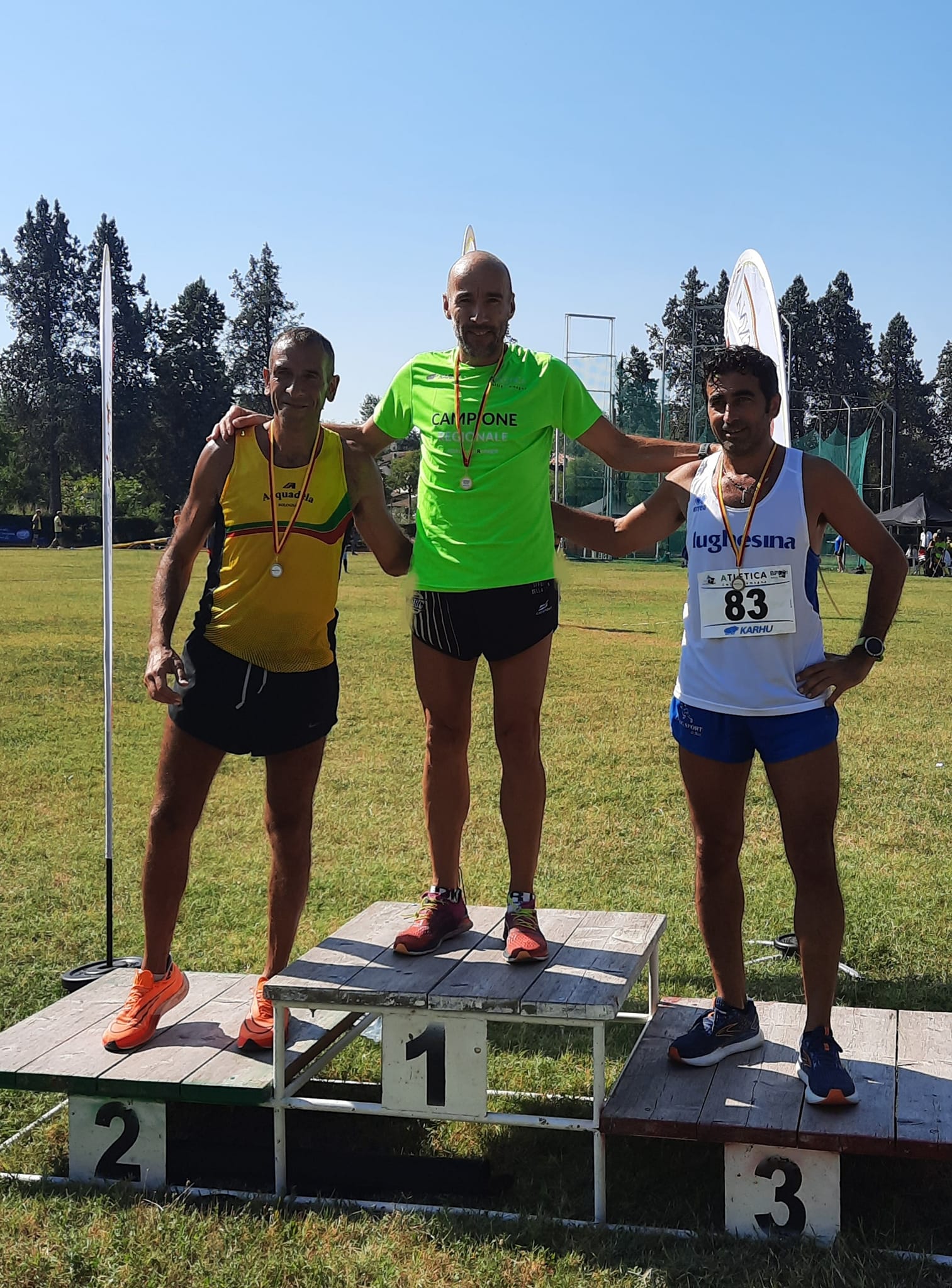 Nelle gare maschili, nei 100 metri un problema al cronometraggio automatico nella prima serie (con i master più giovani) ha impedito l'assegnazione dei tempi agli atleti, ma non la posizione; almeno la citazione è quindi d'obbligo per i vincitori dei titoli regionali delle categorie 35 e 40, Gianmattia Guglielmini (Fratellanza 1874 Modena) e Alessandro Trapezio (Acquadela Bologna). Nelle altre serie il miglior tempo è stato di Andrea Portalatini, sm50 della Fratellanza 1874 Modena, con 11.69 (+1,1). Nei 200 metri 24.77 (+0,3) per Alex Serafini (Atl. Santamonica Misano). Nei 400 metri spicca il 56.33 di Mirko Paolini (Fratellanza 1874 Modena) categoria sm50, ma anche la seconda gara dell'atleta più anziano in gara, Giancarlo Vecchi (Acquadela Bologna), classe 1936 e sm85, che ha corso il giro di pista in 1.54.71, 20 minuti i poco più dopo avere corso i 100 metri in 21.32 (+0,5). Negli 800 metri la replica del successo del giorno precedente nei 400 metri per Kouipomon Achille Deeo, sm35 equiparato del Circolo Minerva, con 2.05.86. Nei 1500 1° posto per Giuliano Casari (Gabbi Bologna), categoria sm45, con 4.34.29, ma an che il 5.50.83 di Aroldo Viroli, sm75 dell'Avis Castel San Pietro. Nei 5000 metri 16.22.66 per Federico Antoniolli, sm35 della Atl. Bondeno, ma in gara anche un atleta sm80, Bruno Buonfiglioli (Atl. Castenaso Celtic Druid) che ha chiuso la gara in 30.00.75. Nei 2000 siepi 8.42.09 per Santi Santangelo, sm70 della Atl. Casone Noceto.