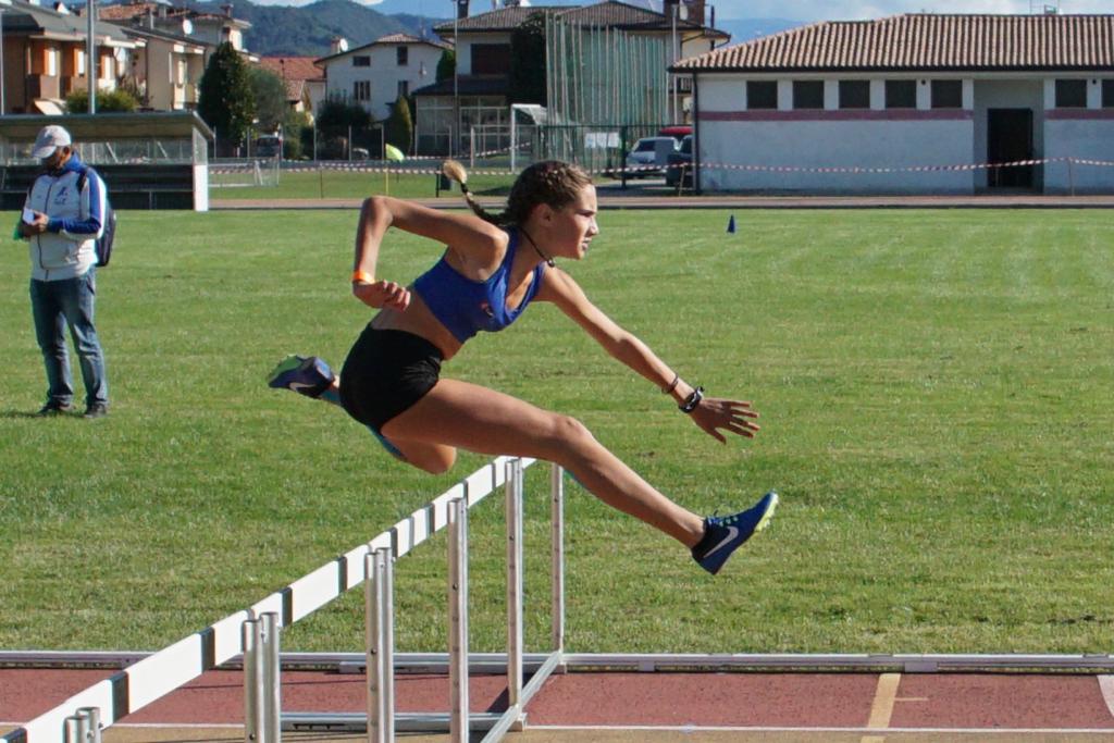 CADETTE. 300: 1. Rebecca Agbortabi (Trevisatletica) 39”61, 2. Elena Cambiolo (Atl. San Bonifacio-Valdalpone) 41”16, 3. Daphne Cordioli (Expandia Atl. Insieme Verona) 42”08. 2000: 1. Denise Marinello (Atl. Jesolo Turismo) 6’59”82, 2. Maddalena Vedova (Coin Venezia) 7’17”47, 3. Greta Zenari (Atl. San Bonifacio-Valdalpone) 7’25”08. 1200 siepi: 1. Rachele Peloso (Atl. Marostica Vimar) 4’06”98, 2. Amelie Candeago (Athletic Club Firex Belluno) 4’07”26, 3. Sara Pistritto (Gs Fiamme Oro Padova) 4’07”41. 80 hs (-0.6): 1. Giorgia Zambon (Gs La Piave 2000) 12”02, 2. Chiara Dal Maso (Atl. Schio) 12”54, 3. Beatrice Buso (Trevisatletica) 12”56. Alto: 1. Chiara Da Pra (Atleticadore-Giocallena Asd) 1.56, 2. Angela Picariello (Csi Atl. Provincia di Vicenza) 1.53, 3. Elena Veronese (Atl. Ovest Vicentino) 1.53. Triplo: 1. Chiara Dal Maso (Atl. Schio) 11.42 (+0.8), 2. Diletta De Cao (Csi Atl. Provincia di Vicenza) 10.59 (+1.2), 3. Giada Dal Santo (Us Summano) 10.57 (+0.6). Peso: 1. Sarah Bernardinello (Csi Atl. Provincia di Vicenza) 12.02, 2. Sofia Dall’O’ (Virtus Este) 11.06, 3. Sofia Benedetta Piovesan (Atl. Piovesan) 11.03. Giavellotto: 1. Sofia Benedetta Piovesan (Atl. Ponzano) 31.07, 2. Irene Fabris (Csi Atl. Provincia di Vicenza) 30.09, 3. Aurora Zullato (Discobolo Atl. Rovigo) 29.74. 4x100: 1. Atl. San Bonifacio-Valdalpone (Errante Parrino, Ugboma Nwike, Confente, Cambiolo) 49”11, 2. Expandia Atl. Insieme 50”06, 3. Csi Atl. Provincia di Vicenza 50”50.