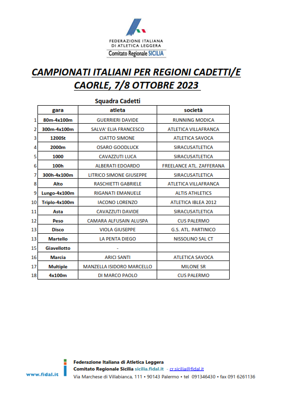 CAMPIONATI ITALIANI PER REGIONI CADETTI/E CAORLE, 7/8 OTTOBRE 2023