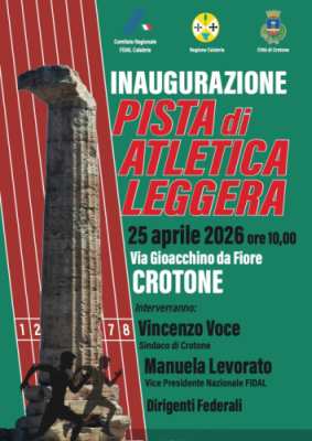 16 Aprile 2026Sabato 25 aprile 2026 grande festa a Crotone per l’inaugurazione dell’impianto di atletica leggera Giuseppe Faga ex Settore B in Via Gioacchino da Fiore, dove per l'occasione saranno disputati i Campionati Regionali Giovanili per le categorie esordienti e ragazzi.