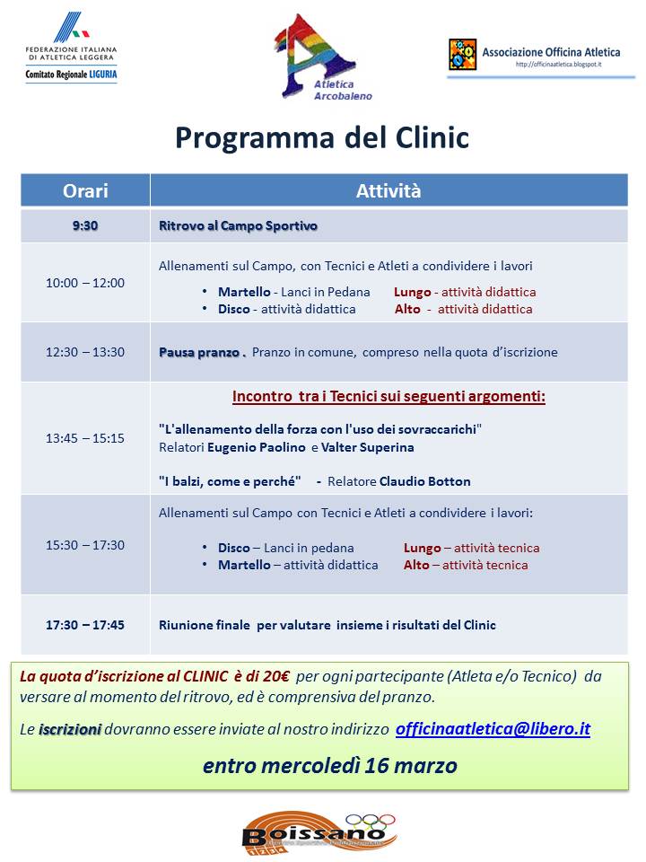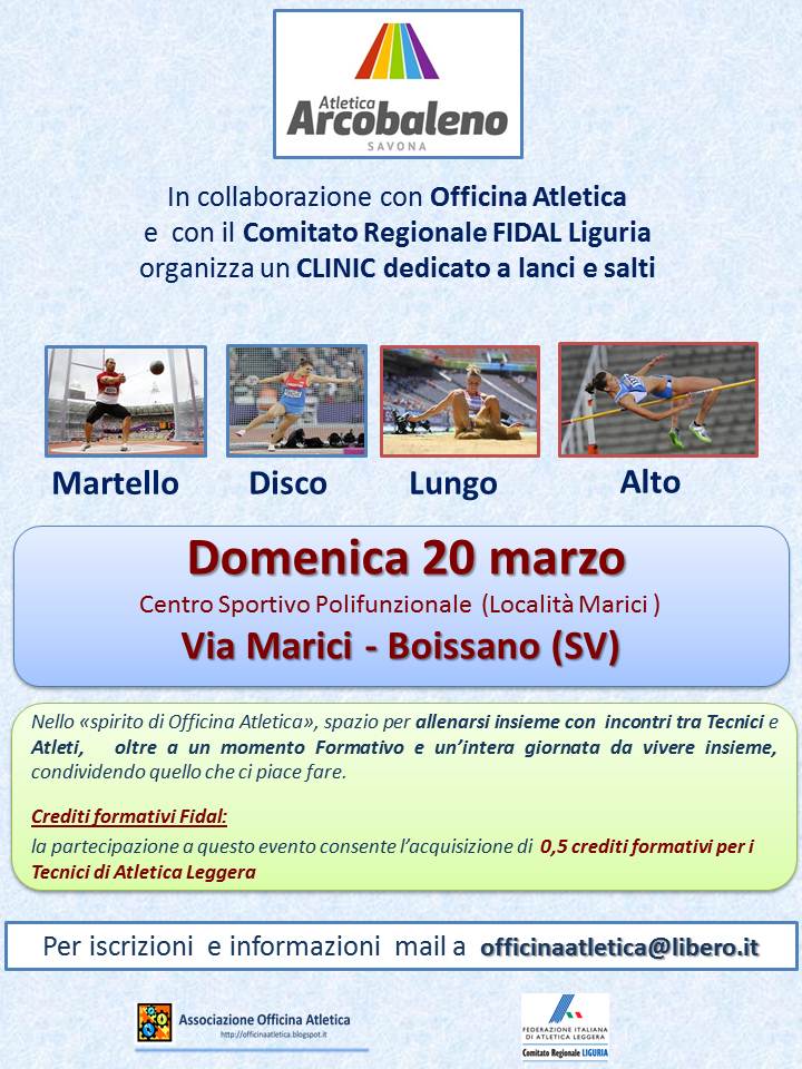 09 Marzo 2016Il giorno 20 marzo, presso il campo di Boissano si svolgerà il Clinic rivolto ai lanci e salti, comprendente sia momenti pratici sia interventi teorici.