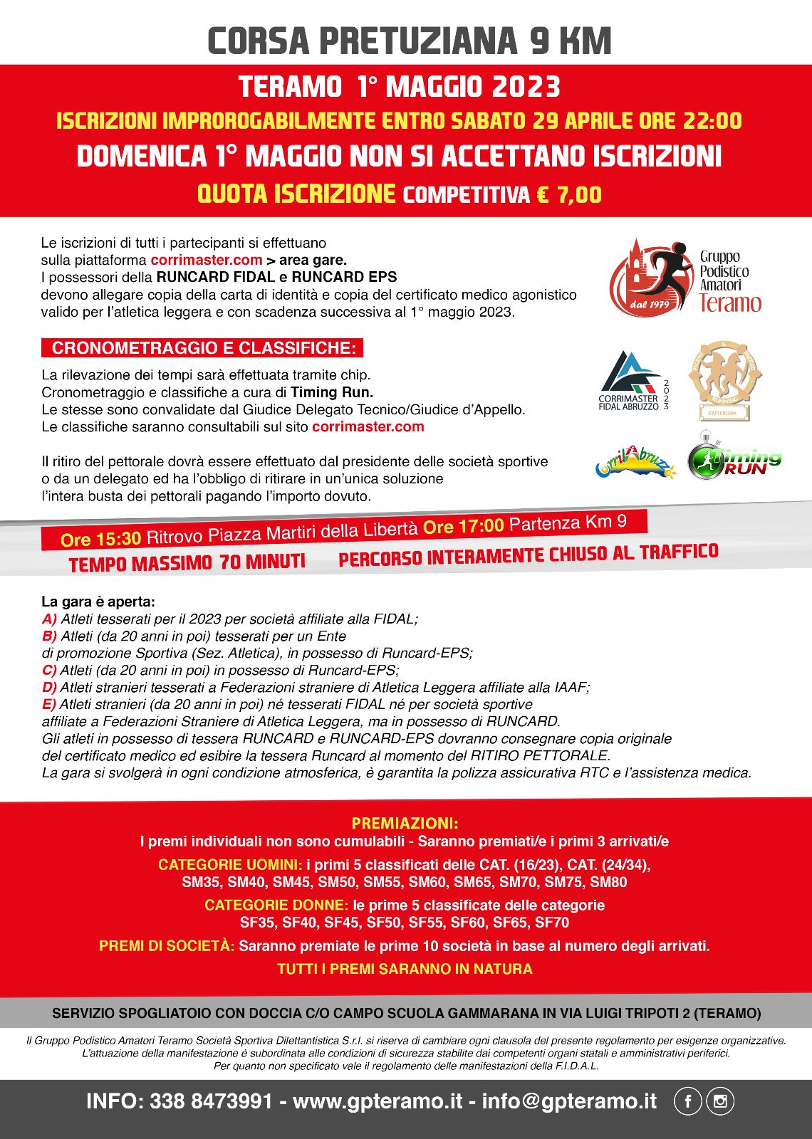 27 Aprile 20231° Maggio in Abruzzo vuol dire anche Corsa Pretuziana, giunta alla 42^ edizione, una delle grandi classiche del podismo abruzzese, fino a qualche anno fa inserita nel calendario nazionale. La manifestazione è valida per il calendario FIDAL regionale Corrimaster. Il centro di Teramo si affollerà di podisti, che si raduneranno in Piazza Martiri della Libertà dalle ore 15.30. Il via alla gara competitiva di Km 9, che attraverserà le strade del centro storico cittadino, sarà dato alle 17.00. Tempo massimo di percorrenza 70 minuti, oltre il quale non ci sarà l’inserimento in classifica. L’organizzazione è curata dalla società Amatori Teramo. Iscrizioni entro le ore 22.00 di sabato 29 aprile dalla piattaforma corrimaster.com La quota è di 7 €. Prevista la presenza dei migliori specialisti abruzzesi, ma saranno tanti anche quelli provenienti dalle Marche. Saranno premiati i primi tre assoluti maschili e femminili e i primi cinque di ogni categoria. Volantino Regolamento