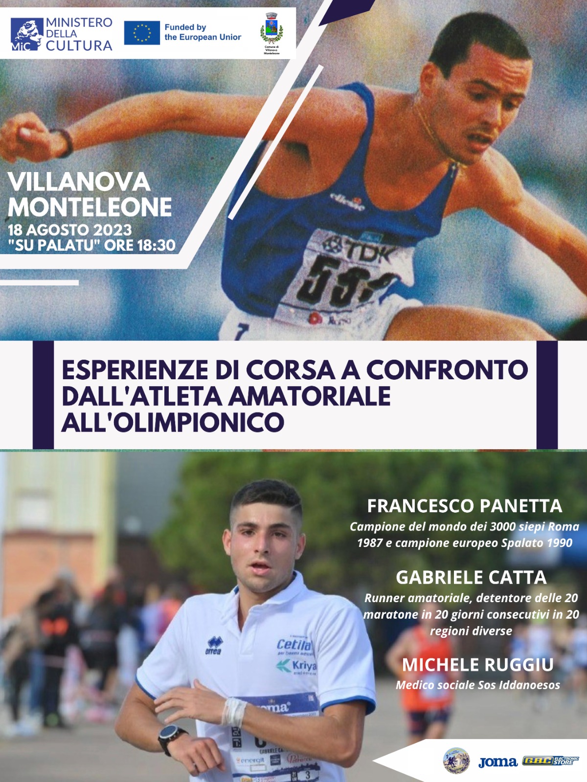 Il 18 agosto alle ore 18:30 presso su Palattu De Sas Iscolas si terrà il convegno dal titolo “Esperienze a confronto dall’atleta amatoriale all’Olimpionico”. Relazioneranno il Campione del mondo dei 3000 siepi Roma 1987 e campione Europeo Spalato 1990 Francesco PANETTA, il runner amatoriale detentore del record delle 20 maratone in 20 giorni consecutivi in 20 regioni diverse, Gabriele CATTA e Michele RUGGIU, medico sociale della ASD Sos Iddanoesos.