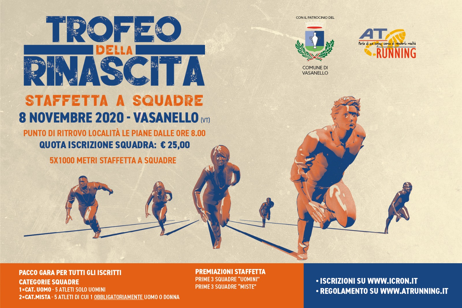 DOMENICA 8, a Viterbo, si sarebbe dovuta svolgere la prima edizione del Trofeo della Rinascita, organizzata dalla AT Running, nella località di Vasanello. Gara in modalità staffetta a squadre sulla distanza di 5 km. Le squadre dovevano essere composte da 5 atleti uomini e squadre composte da 5 atleti misti tra uomini e donne. Ogni atleta avrebbe percorso un giro di 1000 metri sfidandosi su un percorso “all’Americana”.