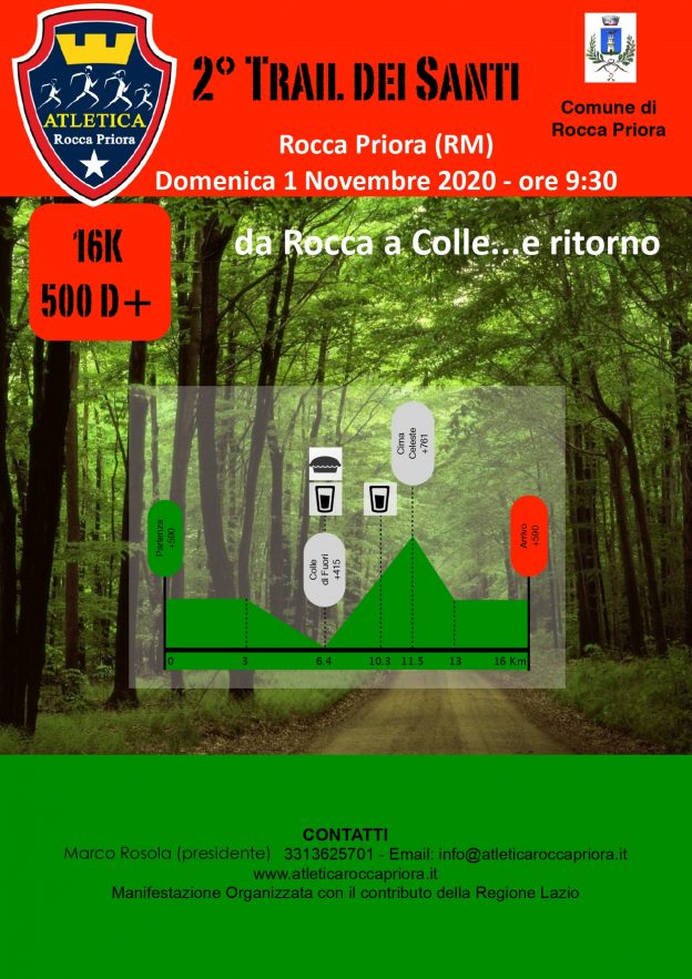 GARE DI NOVEMBRE – Queste le gare che si sarebbero dovute svolgere nella nostra regione, nel mese di novembre: DOMENICA 1, a Rocca Priora con la seconda edizione del Trail dei Santi, organizzata dall’Atletica Rocca Priora. Manifestazione facente parte delle gare di Ultramaratona. Corsa sulla distanza di 16 km, con partenza dallo stadio “Montefiore”, percorso interamente sterrato e dislivello 500+. Il comunicato del presidente Marco Rosola: “Volevamo comunicare che in base al nuovo DPCM datato 24 ottobre 2020, e nello specifico in relazione a quanto previsto “dall’art 1 lettera e)”, ci vediamo costretti ad annullare il 2° Trail dei Santi in programma a Rocca Priora il prossimo 1° novembre.