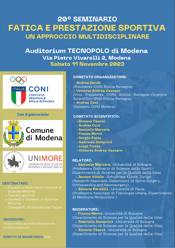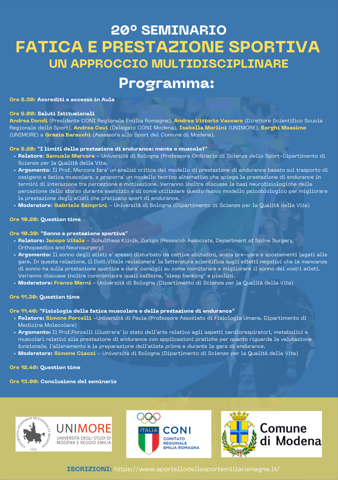Questo il link per iscriversi al seminario: https://www.sportellodellosportemiliaromagna.it/eventi/20-seminario-fatica-e-prestazione-sportiva-un-approccio-multidisciplinare/