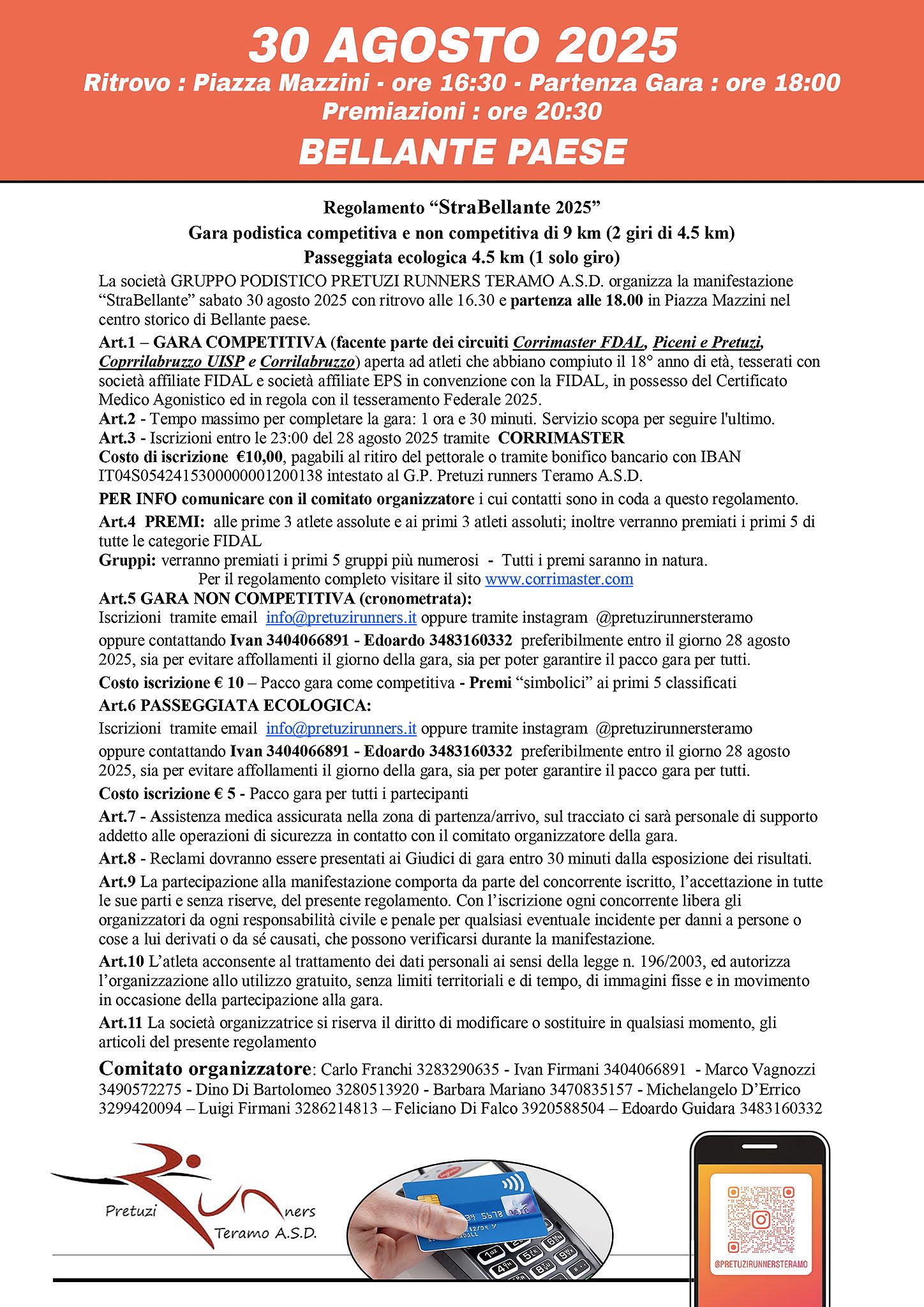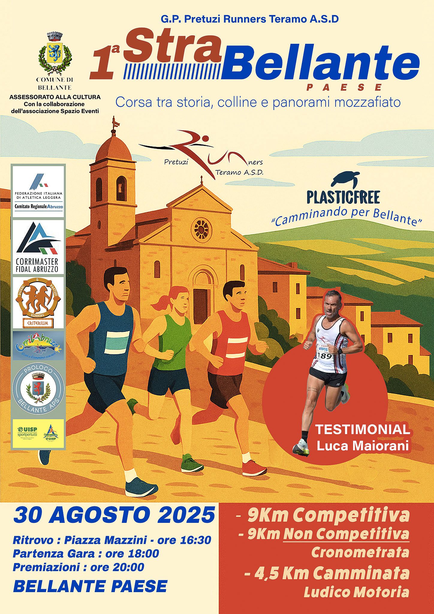 Sabato 30 agosto si corre a Bellante, in provincia di Teramo, per la 1^ StraBellante di Km 9 (2 giri da 4,5 Km). Corsa tra storia, colline e panorami mozzafiato. Il via sarà dato alle ore 18.00 da Piazza Mazzini (tempo massimo di percorrenza 1 ora e 30 minuti), dove è posto il ritrovo dalle ore 16.30. L’organizzazione è curata dalla società Pretuzi Runners Teramo. Iscrizioni entro le ore 23.00 di giovedì 28 agosto dal sito Corrimaster. La quota è di 10 €.  Volantino Crecchio  Regolamento Crecchio  Volantino Bellante  Regolamento Bellante