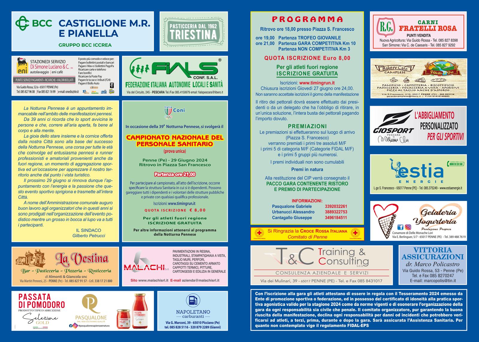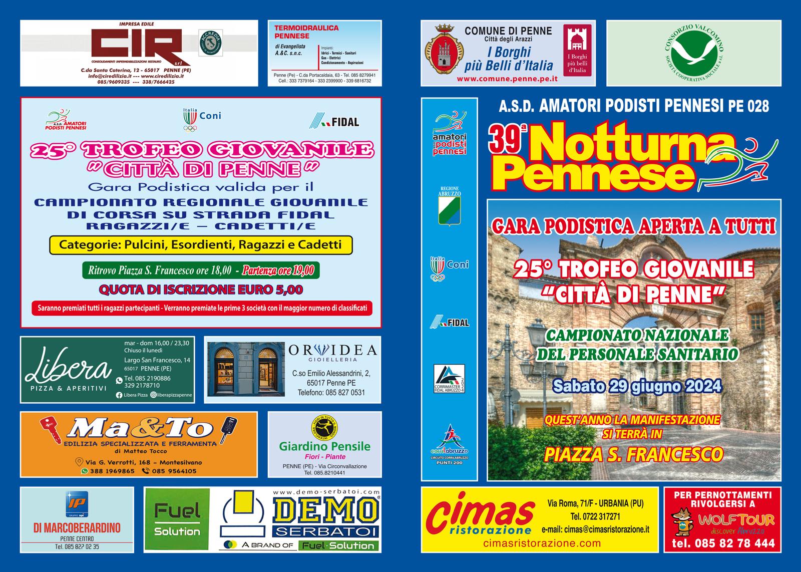 Sabati 29 giugno si svolgerà a Penne una delle classiche abruzzesi, la Notturna Pennese, giunta alla 39^ edizione. La gara si snoderà lungo le vie del centro paese per una distanza di Km 10. L’organizzazione è curata dalla società Podisti Pennesi. E’ inserita nella stessa manifestazione il Trofeo Giovanile, con inizio alle ore 19.00, valevole come Campionato Regionale di Cadetti e Ragazzi di Corsa su Strada. Iscrizioni entro le ore 24.00 di giovedì 27 giugno. La quota è di 8 €. Volantino Penne Penne 2 Volantino Roseto