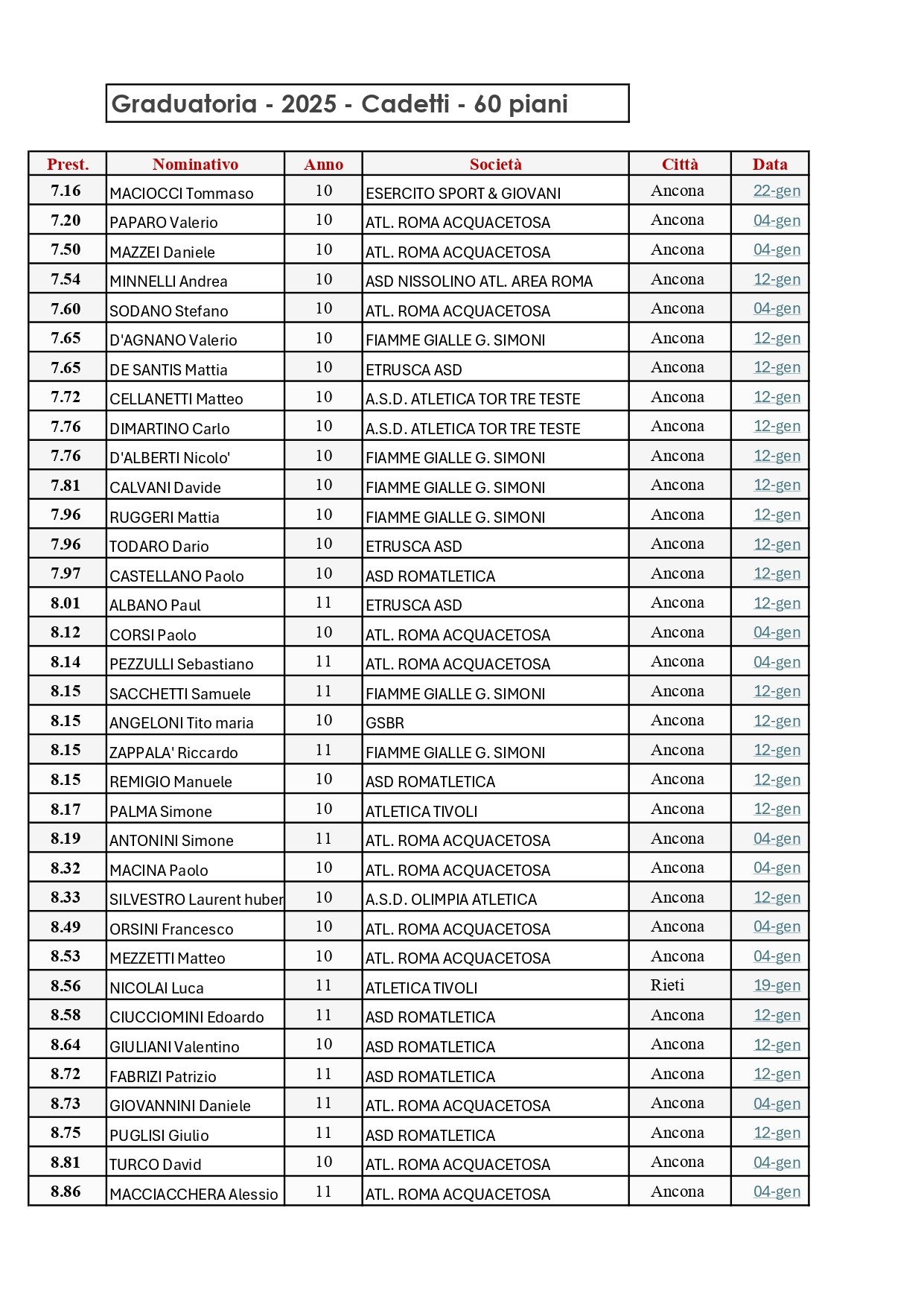 Graduatorie Provinciali Cadetti 60 metri