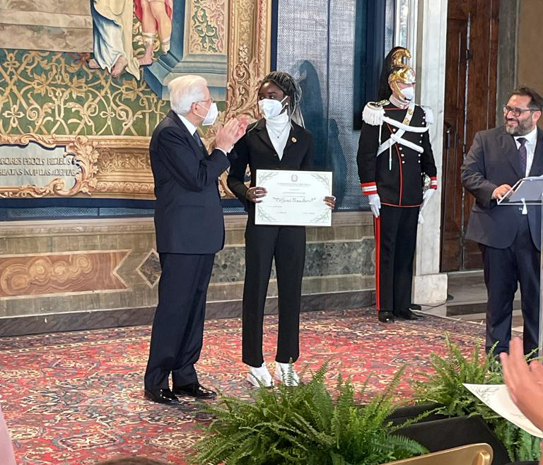 La 17enne torinese ancora in attesa della cittadinanza italiana, più volte campionessa nazionale giovanile nell’asta e nello sprint (in virtù dei regolamenti federali che le permettono di gareggiare come “equiparata”), ha ricevuto il riconoscimento dal Capo dello Stato, alla presenza del presidente della FIDAL Stefano Mei: “Per le sue qualità di atleta, affinate pur tra difficoltà, e per la disponibilità che mostra nell’aiutare i compagni e nel collaborare alla formazione e all’allenamento dei più piccoli”, la motivazione ufficiale.