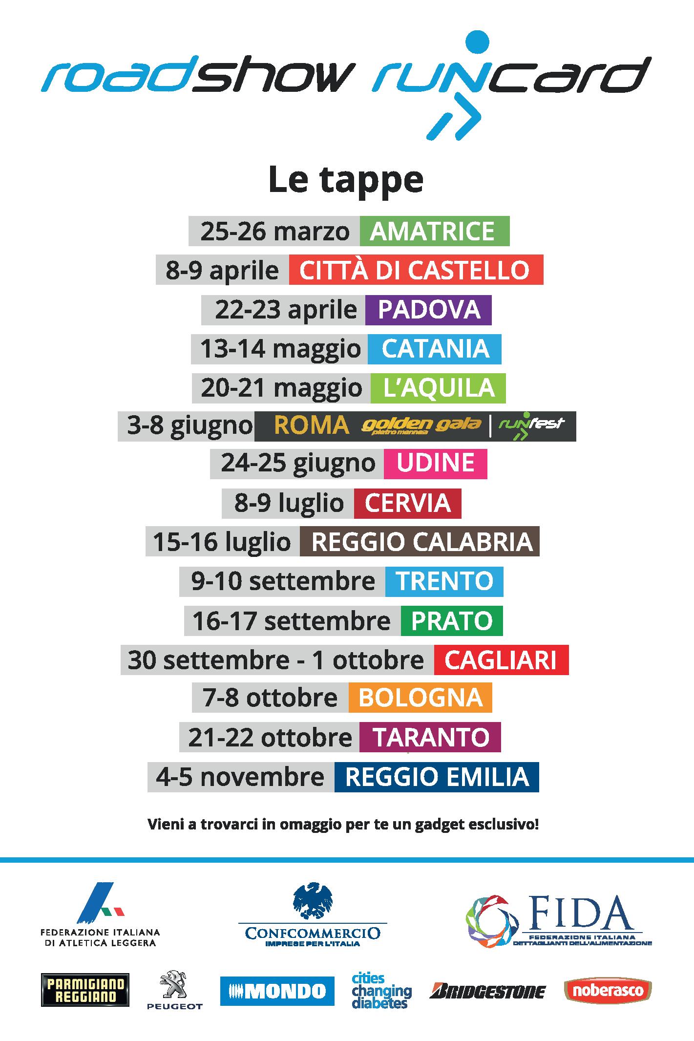 LE TAPPE DEL ROAD SHOW - Il Road Show Runcard, partito il 25 e 26 marzo da Amatrice, la cittadina in provincia di Rieti duramente colpita dal terremoto dell’agosto scorso, consta di 15 tappe: Amatrice (22-23 aprile), Città di Castello (8-9 aprile), Padova (22-23 aprile), Catania (13-14 maggio), L'Aquila (20-21 maggio), Roma (3-8 giugno, nell'ambito di Runfest), Udine (24-25 giugno), Cervia (8-9 luglio), Reggio Calabria (15-16 luglio), Trento (9-10 settembre), Prato (16-17 settembre), Cagliari (30 settembre-1 ottobre), Bologna (7-8 ottobre), Taranto (21-22 ottobre) per concludersi a Reggio Emilia (4-5 novembre).
