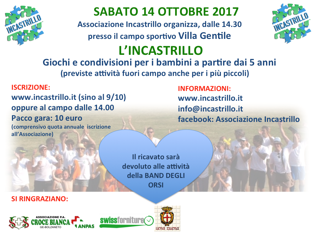 Sabato 14 ottobre 2017 dalle ore 14.30 alle ore 17.00 presso il campo di atletica di Villa Gentile a Genova Sturla, (ingresso da Via Vittorino Era), L’Associazione INCASTRILLO organizza la V edizione della Manifestazione “L’INCASTRILLO”, giornata di gioco e attività motoria dedicata ai bambini delle scuole elementari e alle loro famiglie.