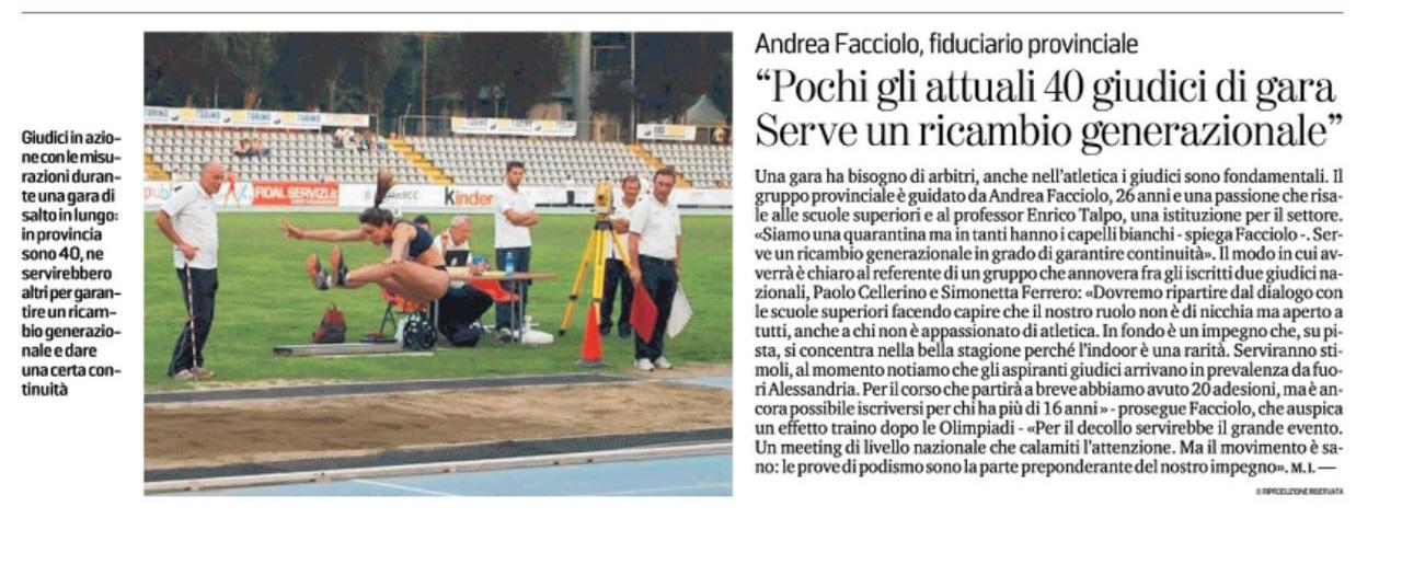 Riportiamo l'articolo apparso sul quotidiano "La Stampa" con l'intervista al Fiduciario Provinciale GGG di Alessandria Andrea Facciolo, per richiamare l'attenzione sulla necessità di nuovi Giudici:Una gara ha bisogno di arbitri, anche nell’atletica i giudici sono fondamentali. Il gruppo provinciale è guidato da Andrea Facciolo, 26 anni e una passione che risale alle scuole superiori e al professor Enrico Talpo, una istituzione per l’atletica non solo provinciale. «Siamo una quarantina ma in tanti hanno i capelli bianchi. Serve un ricambio generazionale in grado di garantire continuità al movimento». Il modo in cui avverrà è chiaro al referente di un gruppo che annovera fra gli iscritti due giudici nazionali, Paolo Cellerino e Simonetta Ferrero: «Dovremo ripartire dal dialogo con le scuole superiori facendo capire che il nostro ruolo non è di nicchia ma aperto a tutti, anche a chi non è appassionato di atletica. In fondo è un impegno che, su pista, si concentra nella bella stagione perché l’indoor è una rarità. Serviranno stimoli, al momento notiamo notiamo che gli aspiranti giudici arrivano in prevalenza da fuori Alessandria. Per il corso che partirà a breve abbiamo avuto 20 adesioni, ma è ancora possibile iscriversi per tutti coloro che hanno più di 16 anni » - prosegue Andrea Facciolo che auspica un effetto traino dopo le olimpiadi - «Per far decollare il movimento servirebbe il grande evento. Un meeting di livello nazionale che calamiti l’attenzione. Ma il movimento è sano: le prove di podismo sono la parte preponderante del nostro impegno».