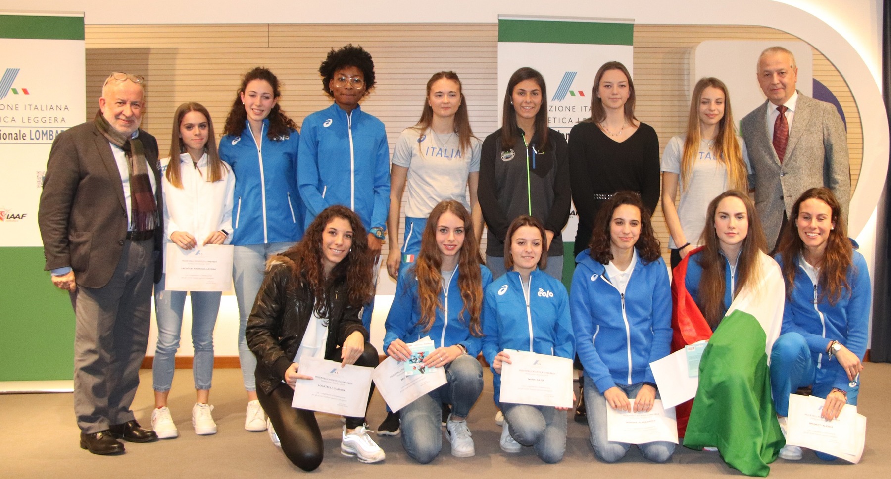 NUMERI DA CAPOGIRO - Impressionanti come da tradizione i numeri proposti dall’annata per la regione: 94 i titoli tricolori conquistati (8 tra i cadetti, 16 tra gli allievi, 21 tra gli juniores, 27 tra le promesse e 22 nel settore assoluto); 31 gli scudetti vinti, tra cui il trionfo dell’Atletica Brescia 1950 Ispa Group nei Campionati di Società assoluti femminili su pista; addirittura 120 le singole presenze in azzurro, con 25 ragazzi che hanno vissuto per la prima volta la gioia di rappresentare l’Italia in Nazionale e con due gemme come il titolo europeo under 20 dei 100 metri di Vittoria Fontana (N. Atl. Fanfulla Lodigiana) e l’oro mondiale under 20 a squadre nella corsa in montagna di Elisa Pastorelli (Atl. Lecco Colombo Costruzioni), che durante la festa hanno ricordato le emozioni vissute rispettivamente a Boras (Svezia) e Villa La Angostura (Argentina). Nell’attività per selezioni regionali cadetti, la Lombardia ha conquistato i prestigiosi titoli italiani a squadre nella combinata sia nella corsa campestre a Venaria Reale sia in pista a Forlì. È stata premiata anche l’attività regionale con alcuni trofei dedicati soprattutto a strada, cross e corsa in montagna e con la consegna di un riconoscimento alle scuole che hanno centrato il titolo nei campionati studenteschi su pista e nella corsa campestre. Eletti poi i giudici e i tecnici dell’anno: come ufficiali di gara Franco Cavallini (Milano), Francesco Denti (Como/Lecco), Camillo Gambetta (Sondrio), Tiberio Poli (Cremona) e Mario Sarcuno (Varese); gli allenatori del 2019 sono invece Pietro Frittoli, coach dei multiplisti Sveva Gerevini e Dario Dester, e Vittorio Ramaglia, che ha plasmato le gemelle Alexandra, Serena e Virginia Troiani. È stato premiato anche “Lo scatto dell’anno”, il concorso fotografico FIDAL Lombardia vinto in questa sua prima edizione da Tommaso Pasetti.