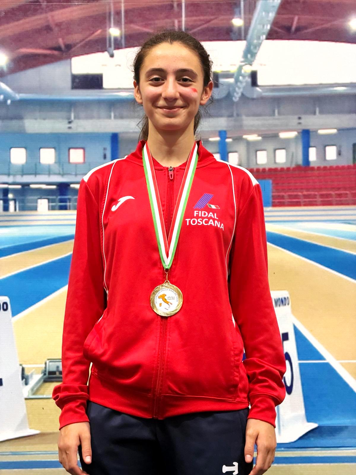 Sul gradino più alto del podio, Virginia Nieri nella marcia 3000 metri che realizza la Migliore Prestazione Italiana di categoria con lo strabiliante tempo di 13'48"12.