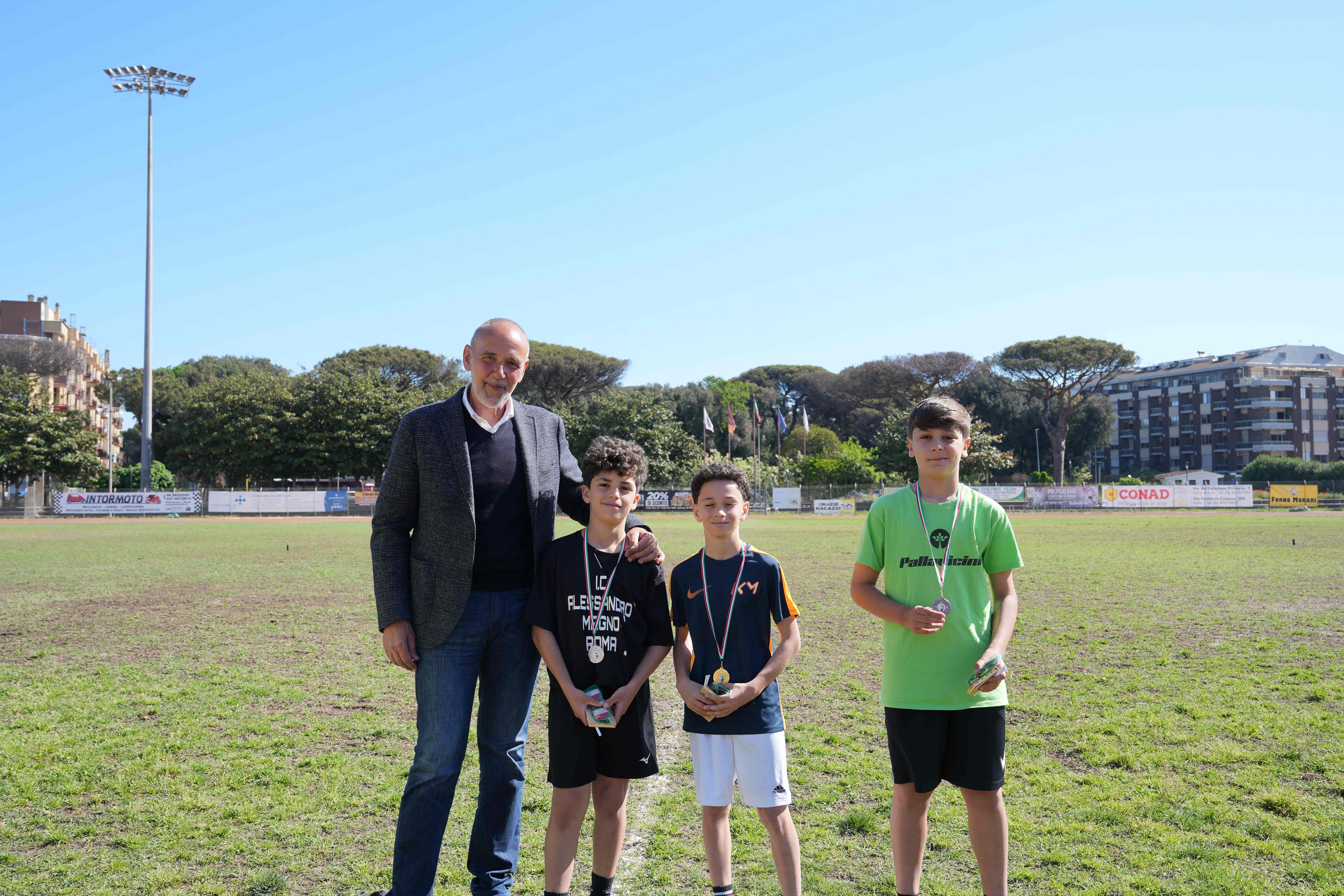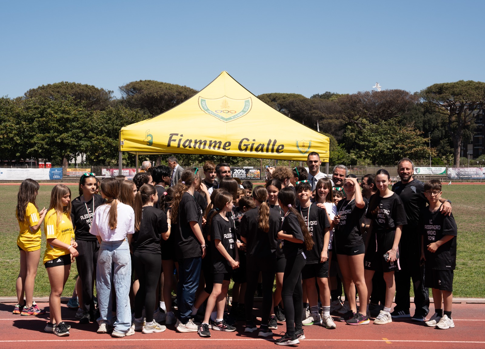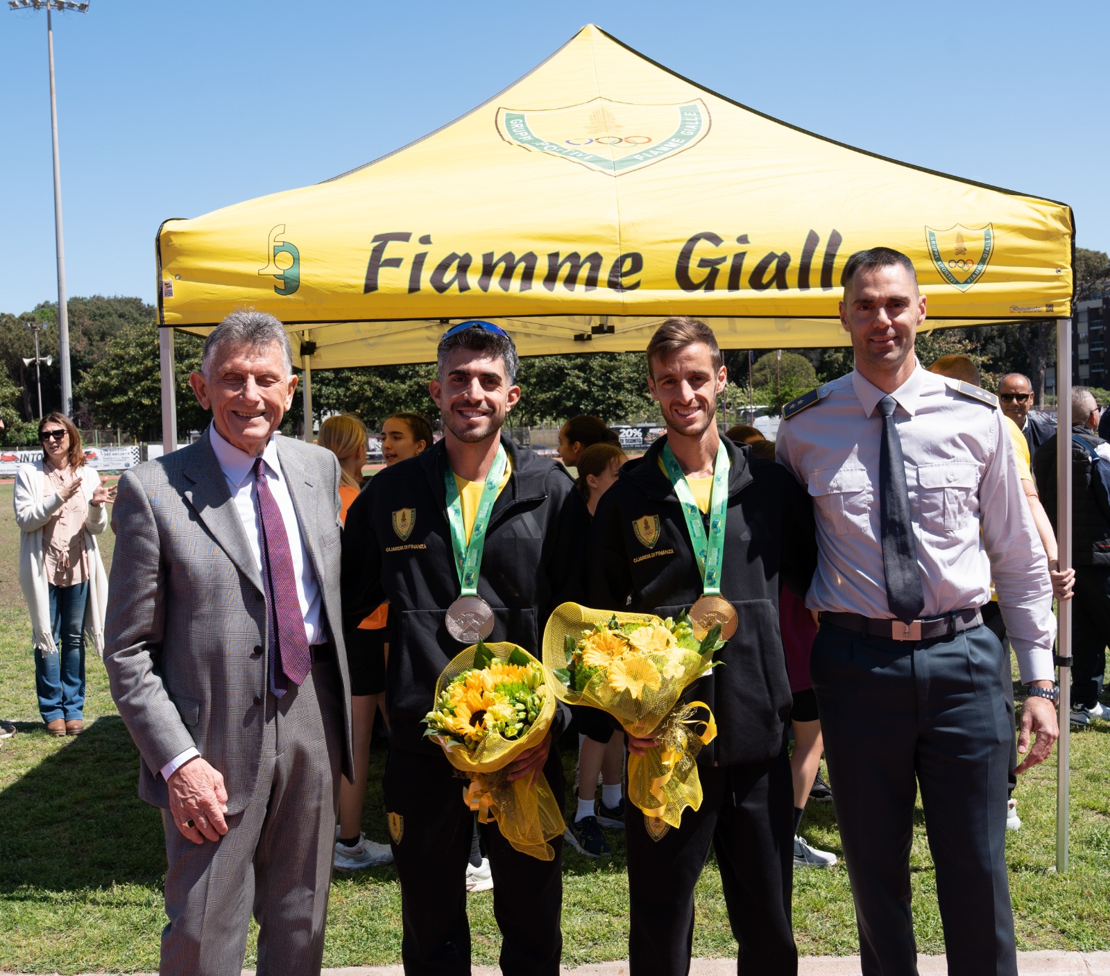 Presenti infatti anche i figli dell’atleta olimpico gialloverde Pasquale Giannattasio - scomparso nel 2002 a cui è stato dedicato il campo di atletica in cui si è svolta la manifestazione oggi - Arturo e Paola Giannattasio; la prof.ssa Maura Catalani, dirigente dell'Ufficio Scolastico Regionale per il Lazio; il Presidente del Comitato Regionale FIDAL Lazio Fabio Martelli, e la rappresentanza ANFI con il Presidente Onorario Gen. D. Gianni Gola. A salutare i ragazzi, anche i due campioni della marcia appena tornati dalla rassegna iridata a squadre di marcia Francesco Fortunato e Andrea Agrusti, che sono stati accolti da un caloroso applauso del pubblico indossando le loro medaglie.