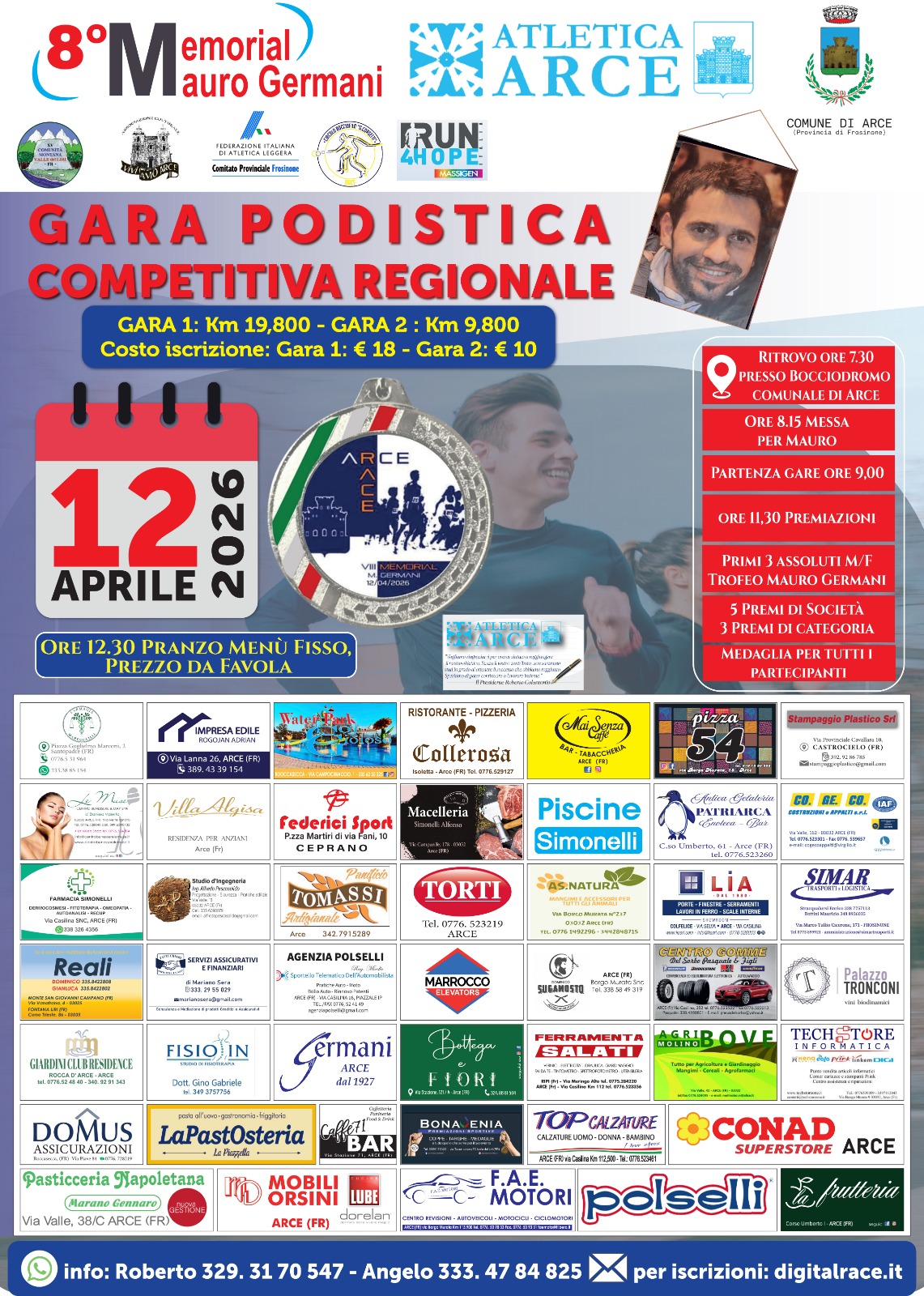 ARCE (Frosinone) – Quest’anno la sesta edizione della Arce Race – Memorial ‘Mauro Germani’, si fa in due con: La Classica di 9,8 km e La Lunga di 19,8 km. Organizza l’Atletica Arce, con il patrocinio del Comune. Partenza alle ore 9 ed arrivo sempre in Via Valle 52 presso il Circolo Bocciofilo Comunale "Giuseppe Corsetti".