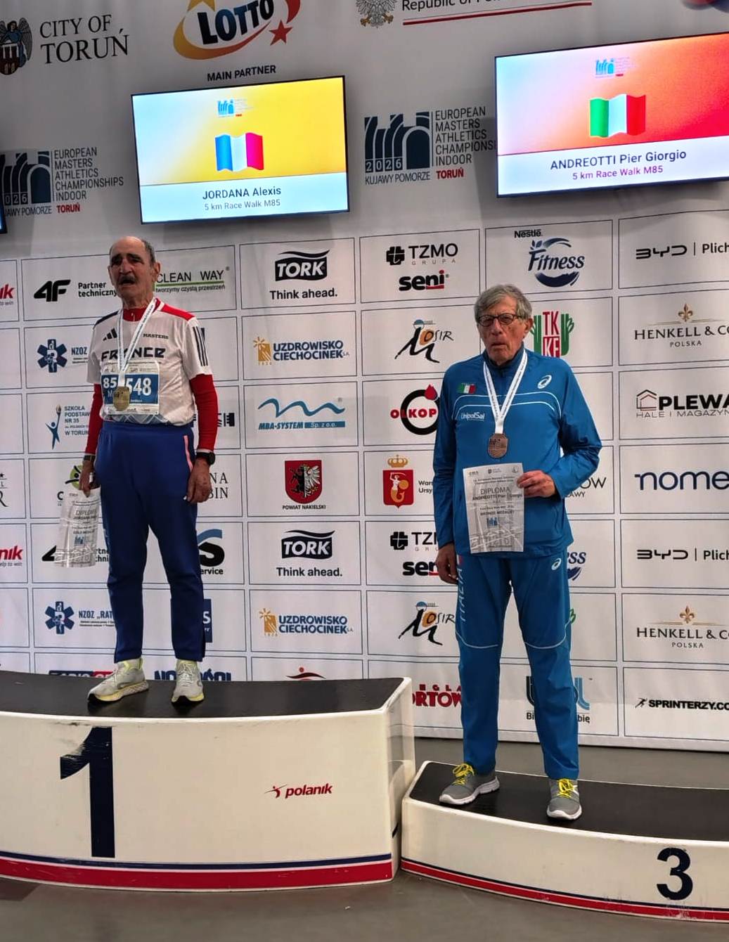 Inarrestabili i due atleti dell’Atletica La Sbarra Roma: Marco Claudio Mastrolorenzi (M65) e Silvia Di Domenico (W40 all’ultimo anno di categoria a livello internazionale), trionfatori ai Campionati italiani indoor ad Ancona e capaci di ottenere varie migliori prestazioni italiane; dalla Polonia ritornano ancora vincenti. Per Mastrolorenzi, 1 oro e 2 bronzi, rispettivamente nell’alto, nell’asta e nel lungo; mentre per Di Domenico, un oro, coronato da una nuova MPI (SF45) nei 60 in 7.81 crono realizzato nella semifinale, migliora di 4 centesimi la sua stessa prestazione ottenuta ad Ancona. Molto competitivo, ancora alla sua età Piergiorgio Andreotti (classe 1940), l’atleta (M85) della Kronos Roma, reduce dai Campionati, con un bottino di 3 medaglie nella marcia: due d’argento, nei 5 km a squadra mista su strada e nei 3000, una di bronzo nei 5 km su strada. Nella velocità, Bruno Santeddu (M65) della Liberatletica, fa bene salendo due volte sul podio: nei 60, mettendosi al collo un argento prezioso e nei 200 con la medaglia di bronzo.