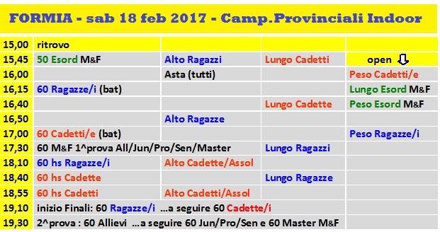 Inteprovinciali indoor Latina/Frosinone: ancora uno scampolo di atletica indoor si terrà nello splendido scenario del Centro di Preparazione Olimpica CONI di Formia, nel pomeriggio di sabato 18 febbraio con i campionati Interprovinciali giovanili indoor di Latina e Frosinone. In programma ci saranno anche alcune gare Allievi, Assoluti e Master sui 60 metri. L'organizzazione è affidata al Comitato Provinciale Fidal Latina. PROGRAMMA ORARIO