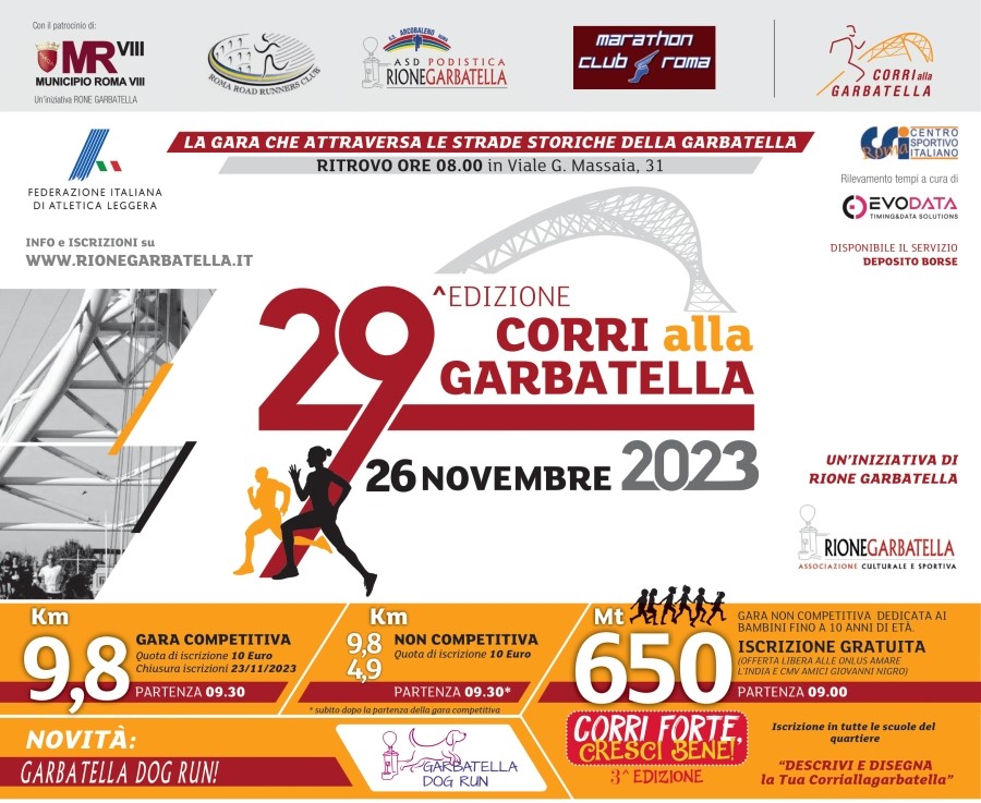 La Corri alla Garbatella, ritorna quest’anno dopo uno stop datato 2019 di 3 anni, con la 29esima edizione sulla distanza competitiva di 9,8 km, una non competitiva di 650 metri riservata a bambini e ragazzi fino ai 10 anni alla terza edizione denominata Corri forte, Cresci bene e la Garbatella Dog Run, camminata non competitiva con cane al seguito.