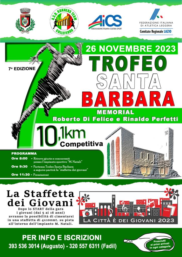 COLLEFERRO (Roma) – La Runners Team Colleferro, con il patrocinio del Comune di Colleferro organizza il 7° Trofeo Santa Barbara - Memorial ‘Roberto di Felice & Rinaldo Perfetti’, gara podistica su strada di 10,1 km per le vie della Città. La manifestazione, classico appuntamento a ridosso dei festeggiamenti dedicati alla Santa Patrona Barbara che si terranno all’inizio di dicembre.