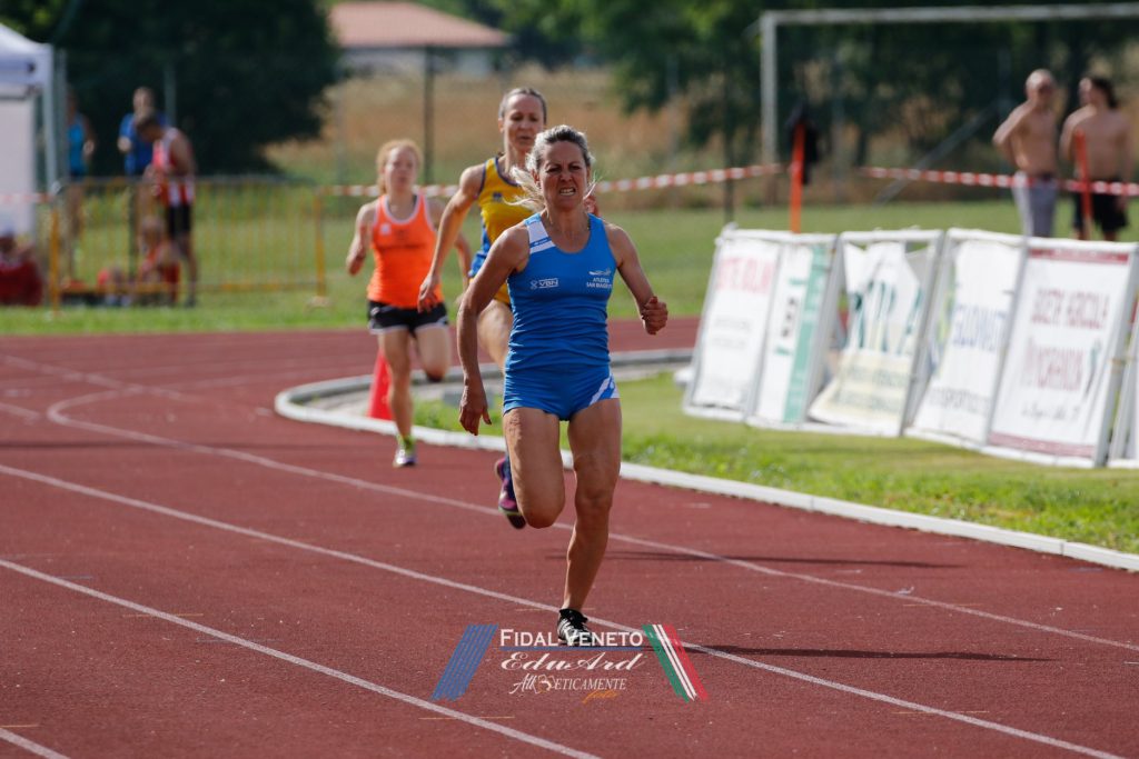 RISULTATI DONNE. 100. 1. Marta Manfrin (ASD Team KM Sport - SF45) 14”39, v. -0.9 (733 p.), 2. Antonella Maso (Riviera del Brenta - SF50) 15”25, v. -0.9 (720 p.), 3. Cristina Sattin (Atl. Dolomiti BL - SF50) 15”46, v. -0.8 (688 p.). 200. 1. Gioia Bellucco (Expandia Atletica Insieme Verona - SF55) 30”74, v. -0.8 (954 p.), 2. Manfrin Marta (A.S.D. Team Km Sport VR - SF45) 29”04, v. -1.1 (826 p.), 3. Cristina Sattin (Atletica Dolomiti Belluno - SF50) 31”03, v. -1.1 (805 p.). 400. 1. Paola Lorena Pascon (Atl. S.Biagio - SF50) 1’07”05 (959 p.), 2. Linda Tosini (Expandia Atl. Insieme VR - SF45) 1’06”54 (866 p.), 3. Lorena Saran (Atl. Ponzano - SF50) 1’12”18 (772 p.). 800. 1. Ines Sartori (Expandia Atletica Insieme Verona - SF50) 2’40”80 (747 p.), 2. Rossella Guariniello (A.S.D. Team Km Sport VR - SF45) 2’39”12 (688 p.), 3. Graziella Misiano (Atletica Stiore Treviso - SF45) 2’44”23 (629 p.). 1.500. 1. Liviana Piccolo (Expandia Atl. Insieme VR - SF70) 7’01”80 (958 p.), 2. Nadia Gardin (Atl. Lib. Mirano - SF50) 5’33”87 (844 p.), 3. Odilla Lorenzoni (ASD Team KM Sport - SF45) 5’32”33 (733 p.). 3.000. 1. Liviana Piccolo (Expandia Atletica Insieme Verona - SF70) 14’49”63 (977 p.), 2. Moira Campagnaro (A.S.D. Polisportiva Brentella PD - SF45) 11’54”25 (744 p.), 3. Odilla Lorenzoni (A.S.D. Team Km Sport VR - SF45) 11’55”96 (740 p.). 200 hs. 1. Monica De Col (Expandia Atletica Insieme VR - SF50) 36”40, v. -1,0 (812 p), 2. Michela Guarise (Atletica San Biagio TV - SF45) 44’’22 v. -1,0 (316 p.). Alto. 1. Lina Costenaro (San Biagio - F55) 1,40 (1.009 p.), 2. Marisa Tavoso (Expandia Atletica Insieme Verona - SF55) 1,17 (714 p.), 3. Amalia Fronda (A.S.D. Team Km Sport - SF55) 1,11 (638 p.). Lungo. 1. Elena Donatoni (Expandia Atl. Insieme VR - SF45) 4,07 v. -1.9 (602 p.), 2. Giuliana Luisetto (Assindustria Sport PD - SF55) 3,41 v. -1.2 (556 p.), 3. Dina Bevilacqua (Vicentina - SF50) 3,39 v. -0.2 (462 p.). Triplo. 1. Simona Mapelli (A.S.D. Team Km Sport VR - SF45) 5,97 v. +2,1 (35 p.), Peso. 1. Maria Carla Iaia (Voltan Martellago - SF40) 10,73 (803 p.), 2. Francesca Maurizio (Expandia Atl. Insieme VR - SF55) 7,63 (738 p.), 3. Laura Vanzin (Vittorio Atletica - SF40) 8,64 (635 p.). Disco. 1. Laura Vanzin (Vittorio Atletica - SF40) 30,47 (644 p.), 2. Francesca Maurizio (Expandia Atletica Insieme Verona - SF55) 20,49 (553 p.), 3. Rosa Marchi (Expandia Atletica Insieme Verona - SF55) 16,32 (424 p.). Martello. 1. Stefania De Frenza (Virtus Este - SF45) 23,89 (630 p.), 2. Claudia Faraon (Atl. San Biagio - SF55) 21,80 (515 p.) 22,33 (588 p.), 3. Paola Furlan (Atl. Vicentina - SF55) 17,83 (408 p.). Giavellotto. 1. Elena Donatoni (Expandia Atletica Insieme Verona - SF45) 24,59 (578 p.), 2. Alessia Fusato (Riviera del Brenta - SF35) 26,53 (490 p.), 3. Adele Passantino (Atletica San Biagio TV - SF45) 19.84 (447 p.). 4×100. 1. Expandia Atl. Insieme VR Sq. A - SF50 (G.Bellucco - L.Tosini - I.Sartori - M.De Col) 54”66 (985 p.), 2. Atletica San Biagio - SF50 (G.Tronchin - M.Guarise - M.Piasentin - P.L.Pascon) 1’01”63 (726 p.), 3. Expandia Atl. Insieme VR Sq. B - SF50 (F.Maurizio - S.Parrino - E.Donatoni - L.Pelattieri) 1’03”32 (667 p.). 4×400. 1. Expandia Atletica Insieme Verona - SF55 (L. Piccolo - M. De Col - L. Pelattieri - L. Tosini) 5’06”18 (864 p.) 2. Atletica San Biagio - SF50 (S. Milanese - P. Monego - P. Alberti - P.L. Pascon) 5’22”02 (648 p.) 3. Atletica Riviera Del Brenta - SF45 (C.Tassetto - V.Trovò - I.Spolaore - S.Malacarne) 5’26”27 (509 p.).