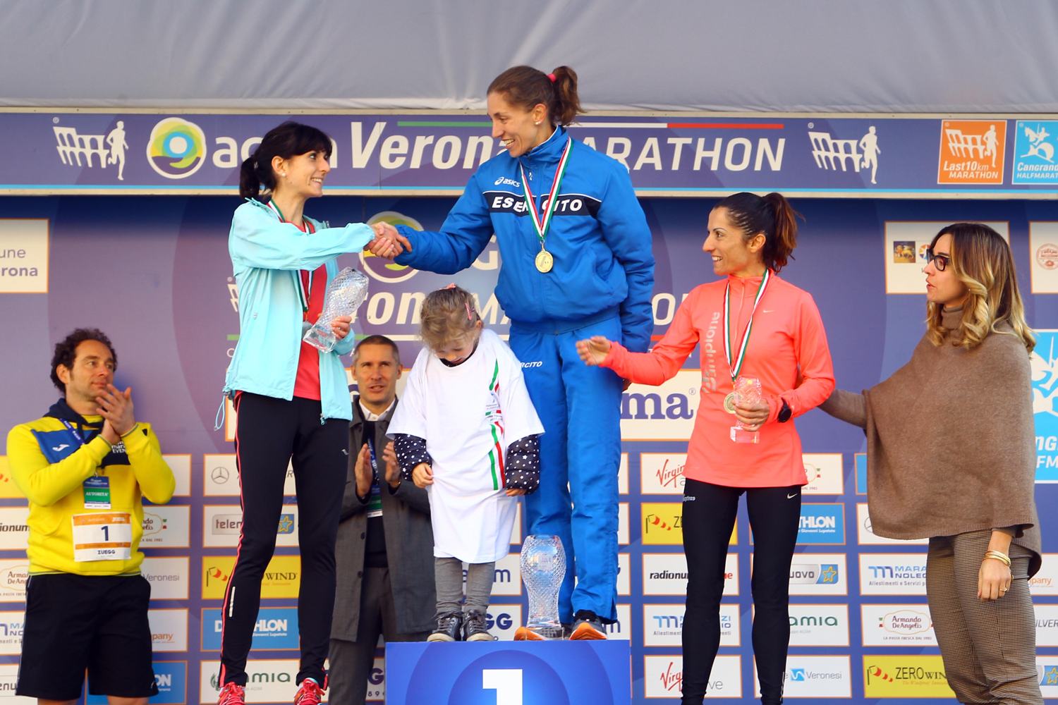 DONNE - Finisce con la piccola Chiara, quattro anni compiuti a luglio, che indossa la maglia tricolore. Insieme a lei c’è la mamma Federica Dal Ri: ha appena vinto il settimo titolo italiano assoluto della sua carriera, ma finora ci era riuscita nella corsa campestre (l’ultimo pochi mesi fa alla Festa del Cross di Gubbio) e su pista (all’aperto e indoor), non su strada. Anche al femminile, una donna sola al comando e in questo caso per il successo nella Veronamarathon, oltre che nella rassegna tricolore. Il termometro segna 5 gradi alla partenza, ma il cielo è sereno. Nei primi chilometri si viaggia a una media di 3:38 ogni mille metri, per una proiezione sotto 2h34. Al giro di boa l’intermedio della trentina è 1h17:25 con un buon vantaggio su Teresa Montrone (1h18:47) che precede di un minuto la coppia formata da Claudia Pinna e Anna Spagnoli (1h19:48), mentre comincia a staccarsi Elisa Stefani (1h19:59). La seconda parte di gara è meno rapida con il successo in piazza Bra alla portacolori dell’Esercito (2h37:45), bronzo a squadre nel cross corto ai recenti Mondiali militari in Ungheria e moglie della colonna azzurra Gabriele De Nard. Per la terza volta corre in meno di 2h38, come nelle ultime due maratone di Padova (2h37:05 nel 2016 e 2h37:54 quest’anno). “Vincere un titolo italiano è sempre un onore - racconta - e quello su strada mi mancava. Ho impostato una gara sui miei ritmi, speravo in un crono più basso ma dal 27° chilometro ho iniziato a sentire la fatica. Da lì in poi ho corso con il cuore e anche grazie al tifo del pubblico ce l’ho messa tutta fino alla fine. Mi sono detta: goditi il viaggio e le sensazioni che può darti, perché la maratona è un viaggio”. Dietro si migliora Teresa Montrone (Alteratletica Locorotondo, 2h38:55): la 29enne pugliese di stanza a Trieste, sorella del canottiere bronzo olimpico Domenico, aveva un personale di 2h39:04 colto in primavera a Milano. Ancora più netto il progresso della 45enne Anna Spagnoli (Edera Atl. Forlì, 2h39:09), rispetto al 2h42:23 ottenuto a Ravenna nel 2015 quando arrivò seconda nella rassegna nazionale.
