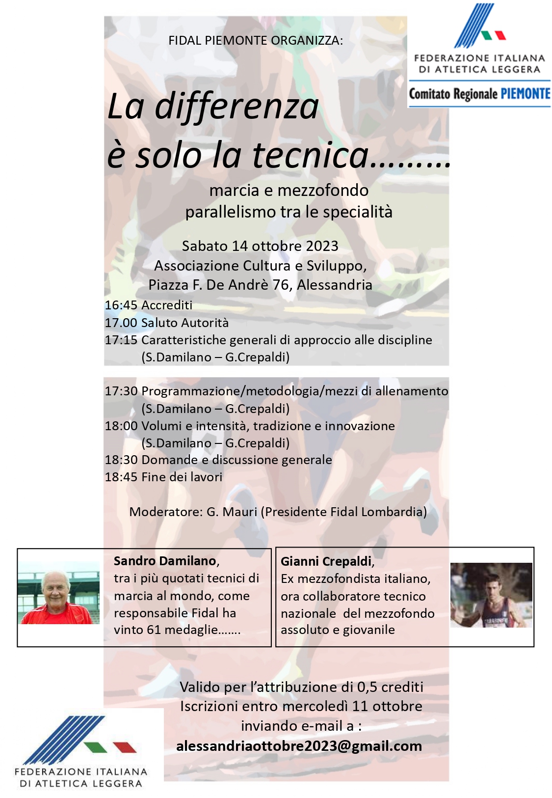 Il convegno si terrà presso la sede dell’Associazione Cultura e Sviluppo di Alessandria (Piazza F. De Andrè 76) a partire dalle ore 17.00 (accrediti dalle 16.45) e sarà valido per l’attribuzione di 0,5 crediti formativi per i tecnici FIDAL.