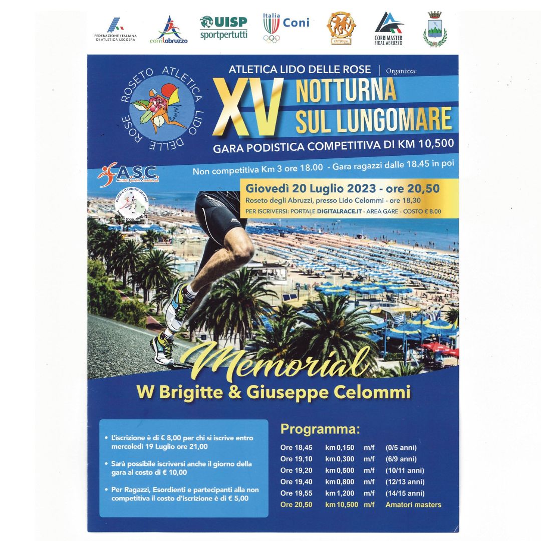 17 Luglio 2023Ancora podismo in una località rivierasca, questa volta a Roseto degli Abruzzi. In programma giovedì 20 luglio la XV Notturna sul Lungomare, manifestazione organizzata dalla società Atletica Lido delle Rose. La gara, con partenza alle ore 20.50 all’altezza di Lido Celommi, si snoderà sulla distanza di Km 10,5. Iscrizioni entro mercoledì 19 luglio dal portale Digitalrace, Area gare. La quota è di 8 €.
