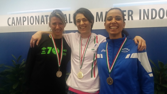 3000 (10.10.10), di Marcello Mondilla M50 nel salto in alto (1.36), di Gianfranco Arturi M60 nei 3 km di marcia (18.44), di Pasquale Chiodo M45 nel lungo (4.15) e di Andrea Villirillo M60 nel peso (9.98). La giovane squadra master costituitasi nel 2014, dopo un biennio di rodaggio, si è amalgamata alla perfezione raggiungendo risultati che vanno oltre le più rosee aspettative. Il prossimo obiettivo sarà quello del Campionato di Società su pista nel mese di giugno, dove la Fiamma Atletica Catanzaro punta a totalizzare un consistente punteggio che le consentirà di disputare la fase nazionale del campionato italiano outdoor in settembre. Oltre ai risultati individuali e di società della compagine catanzarese, altri atleti calabresi si sono distinti durante questi campionati individuali indoor, cominciando dalle neo campionesse italiane Maria Grandinetti SF50 (Atl.Cosenza) che si aggiudica il doppio oro nella gara del martello con maniglia corta con m.13.90, che costituisce anche la miglior prestazione italiana nella specialità e nel lancio del giavellotto con m. 25.04. Piazza d’onore, sempre per la Grandinetti nel lancio del disco che arriva seconda con m. 23.91, a pochi centimetri dall’oro. Non da meno Spyridoula Souma SF50 (Cosenza K42) che vince la gara dei 3000 m. con 11.07.19 e si piazza al secondo posto nei 1500 m con 5.16.41. Antonio Vaccari SM50 (Atl.Cosenza) argento nel lancio del giavellotto con m. 47.41 e due quinti posti nel disco (m. 31.90) e martello con maniglia corta (m. 13.42). Infine i reggini mezzofondisti, portacolori della Cosenza K42, Simona Belvedere (SF35) 5^ sugli 800 m con 2.39.66 e 6^ sui 1500 m. con 5.35.29, Grazia Toma (SF55) 6^ sui 3000 m con 12.52.95 e Luigi Calabrese SM50 decima piazza sui 3000 m. con 10.22.50 e dodicesimo sui 1500 con 4.54.29. Felicitazioni ed auguri a tutti gli atleti con un grosso in bocca al lupo, per chi parteciperà, per i prossimo Campionati Europei Master Indoor che si svolgeranno a fine marzo sempre al Palaindoor di Ancona.