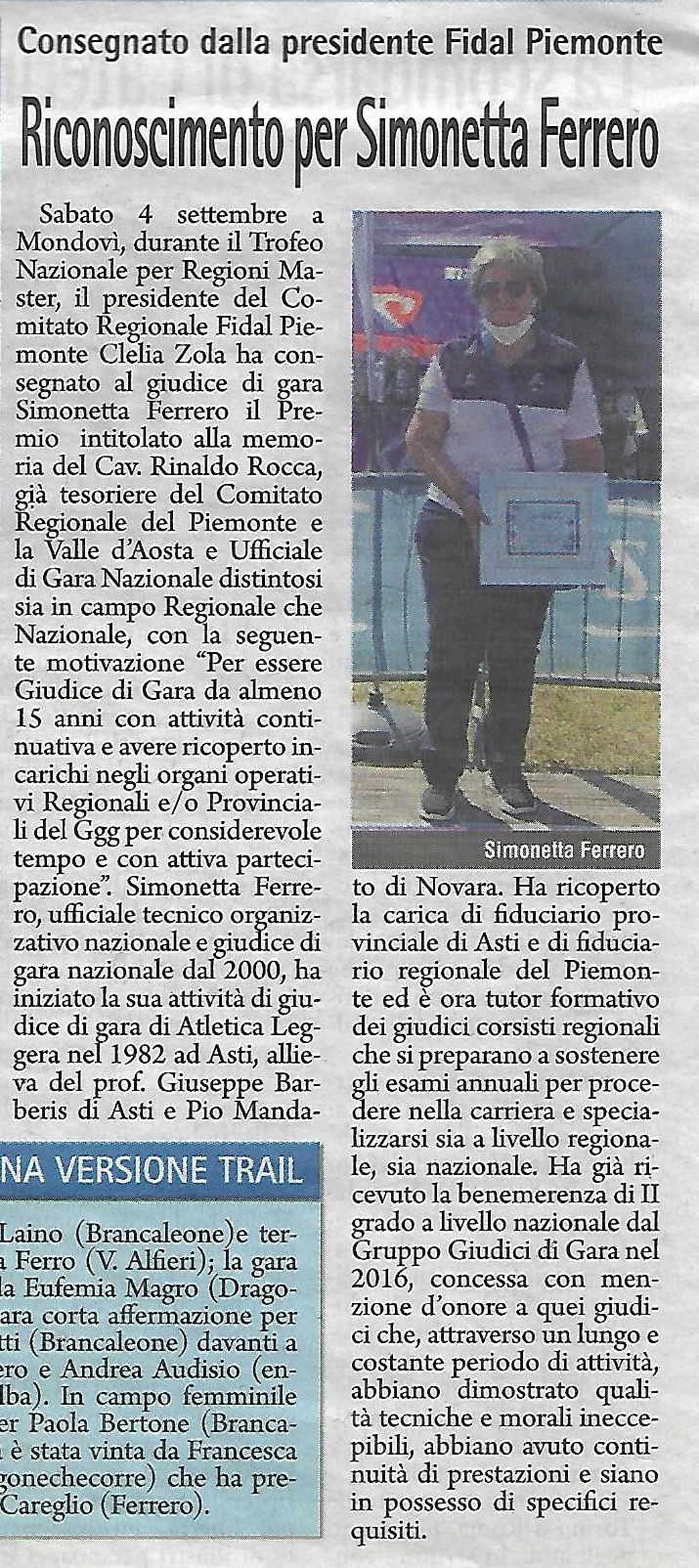 Sabato 4 settembre 2021 a Mondovì, durante il Trofeo nazionale per Regioni Master, il Comitato Regionale Fidal Piemonte, nella persona della Presidente Clelia Zola, ha consegnato al Giudice di Gara Simonetta Ferrero il Premio intitolato alla memoria del Cav. Rinaldo Rocca, già Tesoriere del Comitato Regionale del Piemonte e la Valle d’Aosta, e Ufficiale di Gara Nazionale distintosi sia in campo Regionale che Nazionale, per i criteri di “essere Giudice di Gara da almeno 15 anni con attività continuativa ed avere ricoperto incarichi negli organi operativi Regionali e/o Provinciali del GGG per considerevole tempo e con attiva partecipazione”.