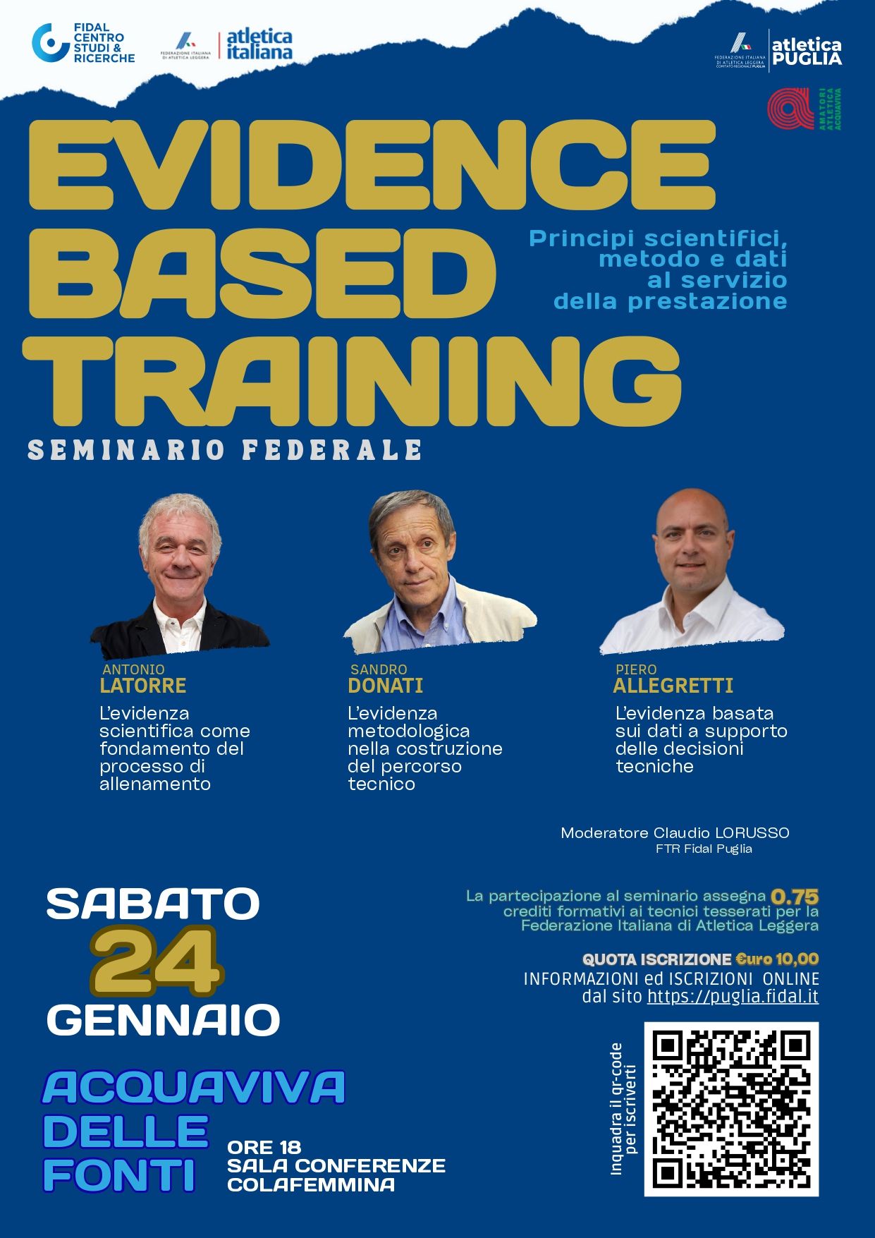 SEMINARIO FEDERALE - Molto atteso anche il seminario federale tecnico “Evidence Based Training - Principi scientifici, metodo e dati al servizio delle prestazioni” con il Direttore Tecnico della Nazionale Italiana di Atletica Leggera, prof. Antonio La Torre e la partecipazione anche dei due Vice della Nazionale: il Dott. Sandro Donati e il Dott. Piero Allegretti che illustreranno evidenze scientifiche nell’allenamento, metodologia tecnica, analisi dei dati a supporto delle decisioni. Il seminario, organizzato dal Centro Studi & Ricerche FIDAL in collaborazione con il Comitato Regionale Pugliese FIDAL e dell’Amatori Atletica Acquaviva, si svolgerà sabato 24 gennaio 2026 con inizio alle ore 18:00 presso la Sala Colafemmina del comune di Acquaviva delle Fonti e sarà moderato da Claudio Lorusso fiduciario tecnico regionale Fidal Puglia.