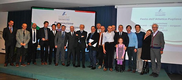19 Gennaio 2014Sabato 18 gennaio l’atletica pugliese ha celebrato il suo 2013 nella gremita Sala “Aquilegia” dell’Hotel Majesty di Bari. L'evento ha visto la presenza del presidente FIDAL Alfio Giomi, del Presidente del CONI Puglia ed Assessore allo Sport del Comune di Bari Elio Sannicandro, del Console d’Ucraina a Bari Lorenzo De Fronzo e di numerose altre autorità civili, militari e sportive tra cui il consigliere federale Giacomo Leone, vincitore della maratona di New York nel 1996 e azzurro a Sydney 2000. Nel parterre anche i campioni pugliesi del passato e del presente tra i quali gli olimpici azzurri Ottavio Andriani (Pechino 2008), Michele Lazazzera (Seul 1988) e il campione europeo indoor 2013 del triplo Daniele Greco (quarto a Londra 2012) affiancato da Francesca Lanciano e dal loro tecnico Raimondo Orsini.