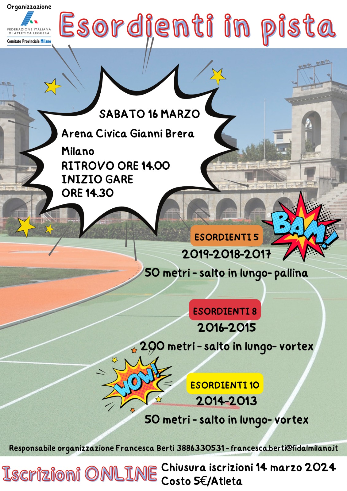 All'Arena di Milano, il Comitato provinciale FIDAL Milano organizza la riunione "Esordienti pista", meeting riservato a tutte le categorie Esordienti chiamate a partecipare a tre gare.