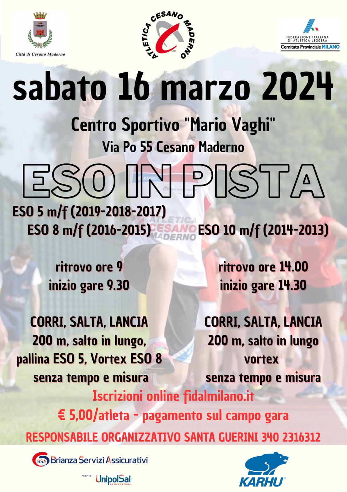 Sempre sabato 16 marzo, ma a Cesano Maderno (Centro sportivo Mario Vaghi, via Po 55), l'Atletica Cesano organizza "Esordienti in pista", riunione riservata a tutte le categorie Esordienti.