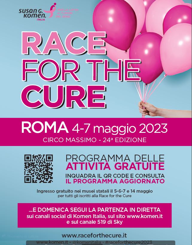 02 Maggio 2023Dal 4 al 7 maggio, ritorna a Roma la 24ª edizione della Race for the Cure 2023. Manifestazione sotto l’alto patronato del Presidente della Repubblica. L’invito alla prevenzione promosso da Komen Italia per la lotta ai tumori del seno, in collaborazione con la Fondazione Policlinico Universitario A. Gemelli IRCCS e la partecipazione di altri presidi ospedalieri, grazie al contributo di Fondazione Johnson&Johnson, Fondo FASDA e UniSalute. Grazie alla collaborazione con numerose Federazioni Sportive saranno allestite apposite aree di pallavolo, pallacanestro, calcio, atletica, judo, scherma e canottaggio e i presenti al Villaggio potranno scegliere tra le tante discipline offerte.