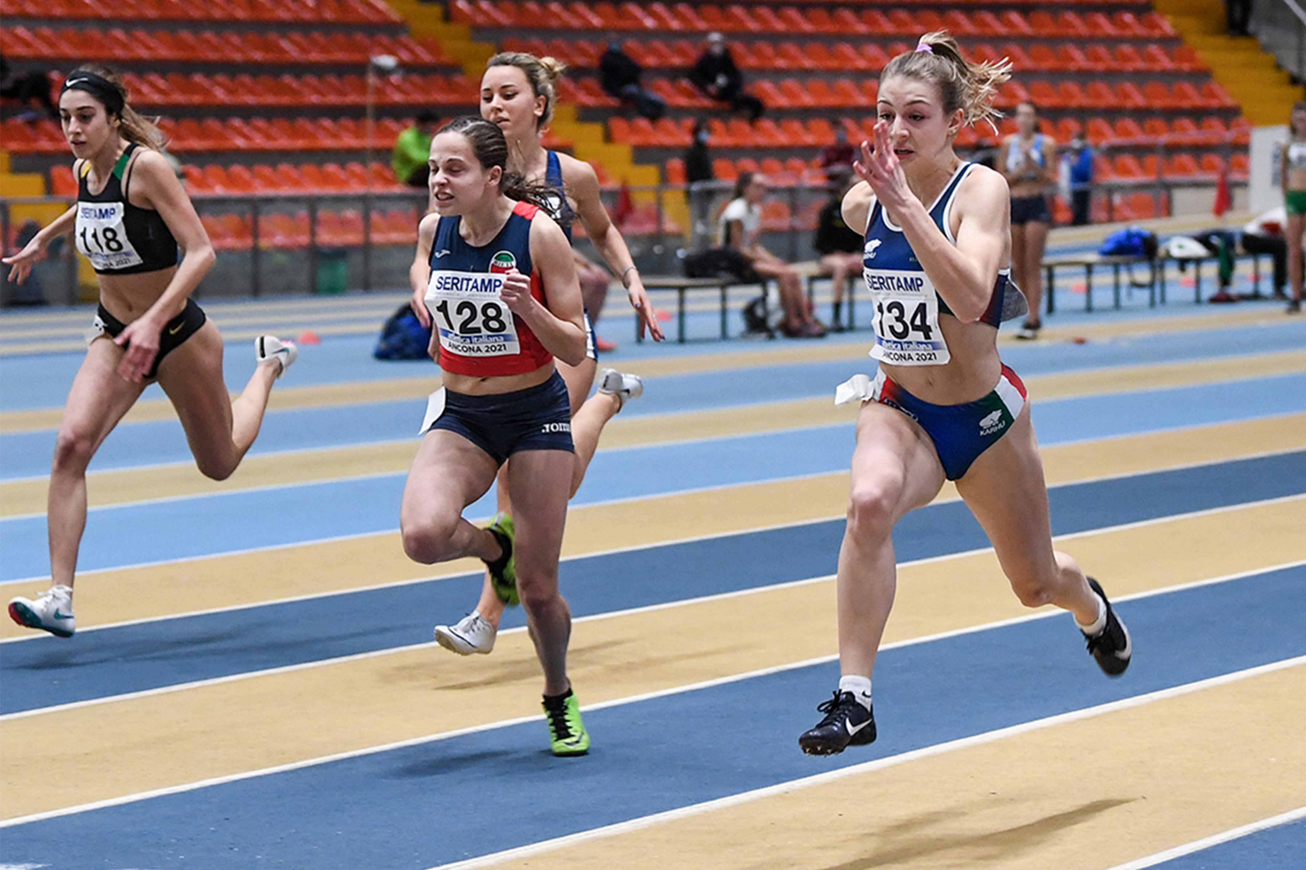 DURI ARGENTO – Nella velocità era attesa alla grande prova Camilla Duri (Studentesca Milardi) che non delude le attese. La velocista romana corre la batteria vincendo in 7.62 poi in finale si migliora. Bella la partenza per la rosso blu e anche l’accelerazione ma per l’oro niente da fare. Una grande Galuppi vince con la migliore prestazione Italiana a 7.45, mentre Duri finisce con il PB seconda a 7.56. Quinta Giulia Colonna (ACSI Italia Atletica), attesa domani sui 200, e Sara Cirillo (Fiamma Gialle Simoni) settima.