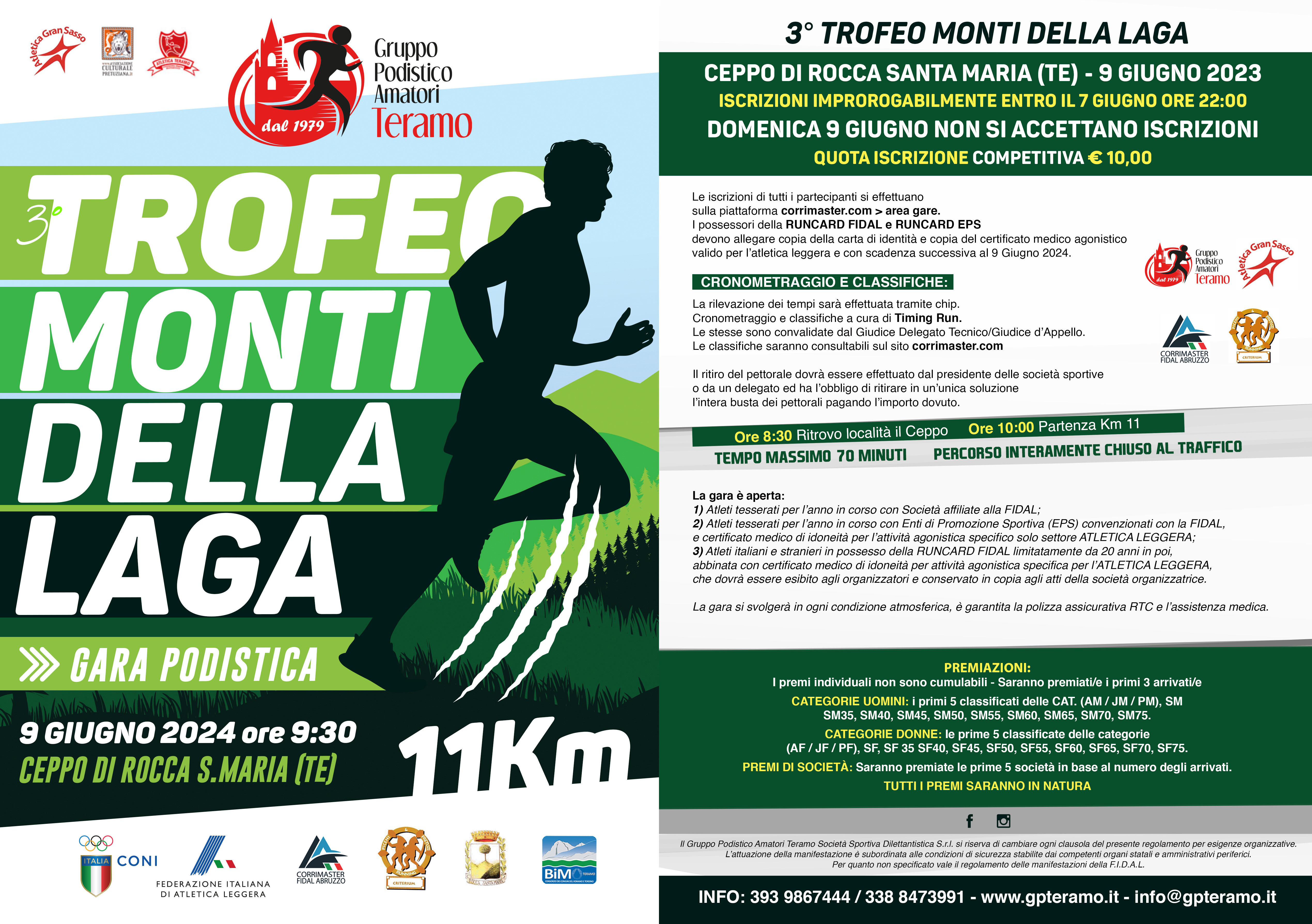 03 Giugno 2024In programma domenica 9 giugno il Trofeo Monti della Laga, a Ceppo di Rocca Santa Maria, in provincia di Teramo. La manifestazione podistica, organizzata dalle società Atletica Gran Sasso e Amatori Teramo, prevede una gara di Km 11, con partenza alle ore 10.00 dalla località il Ceppo. Tempo massimo di percorrenza: 70 minuti. Iscrizioni entro le ore 22.00 di venerdì 7 giugno. La quota è di 10 €. Volantino e regolamento