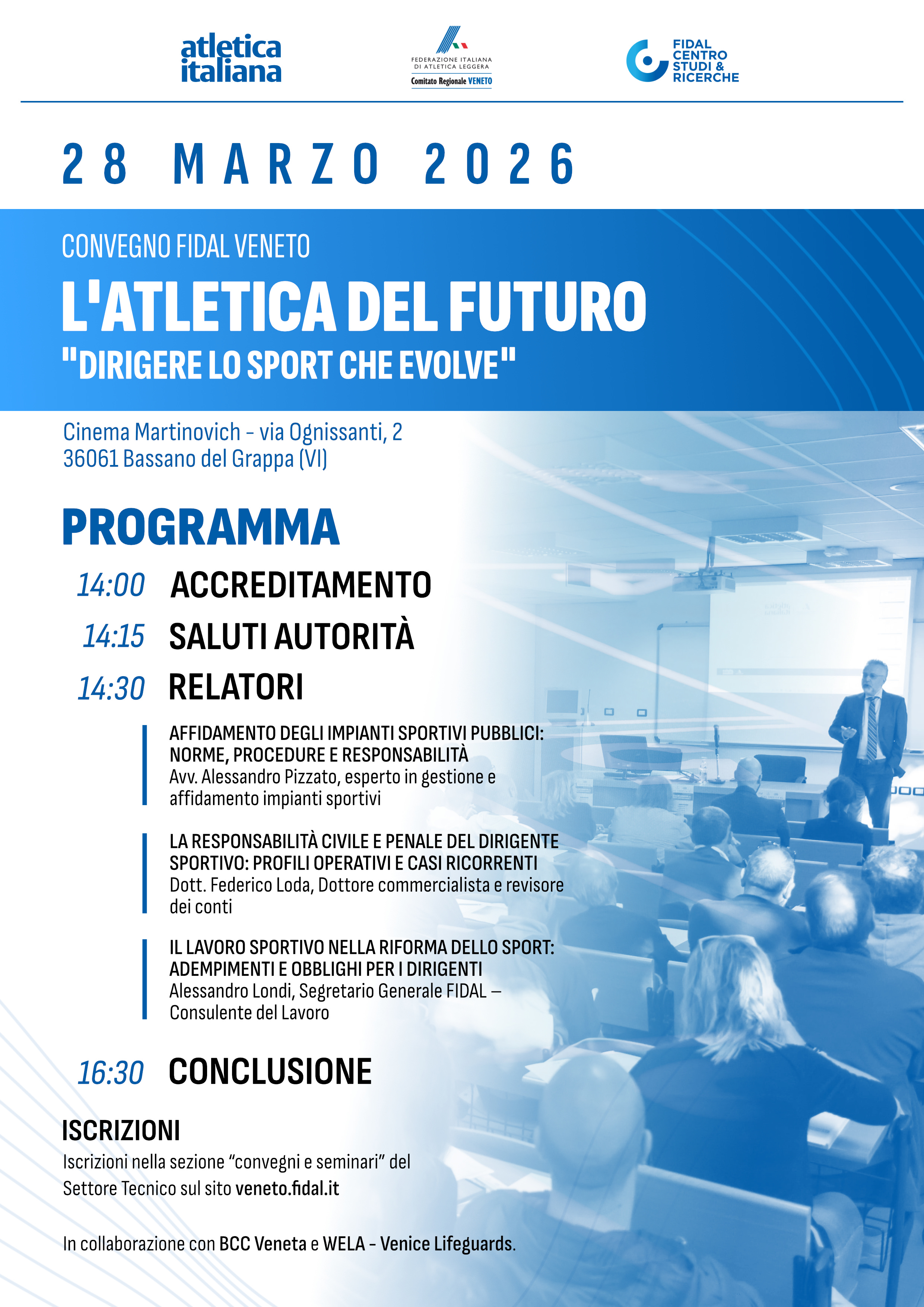 Le iscrizioni al convegno sono gratuite e devono essere effettuate nella sezione “Convegni e seminari” del Settore Tecnico sul sito veneto.fidal.it.