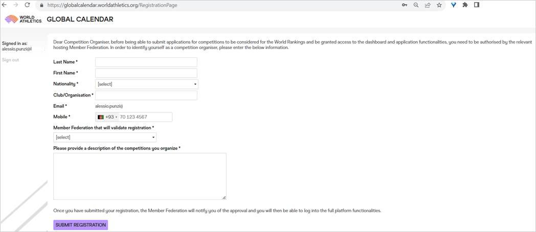 Accedere all'indirizzo https://globalcalendar.worldathletics.org/ e procedere con la registrazione. Una volta confermato l'indirizzo email (da parte della FIDAL) sarà possibile accedere e la schermata visualizzata è la seguente: