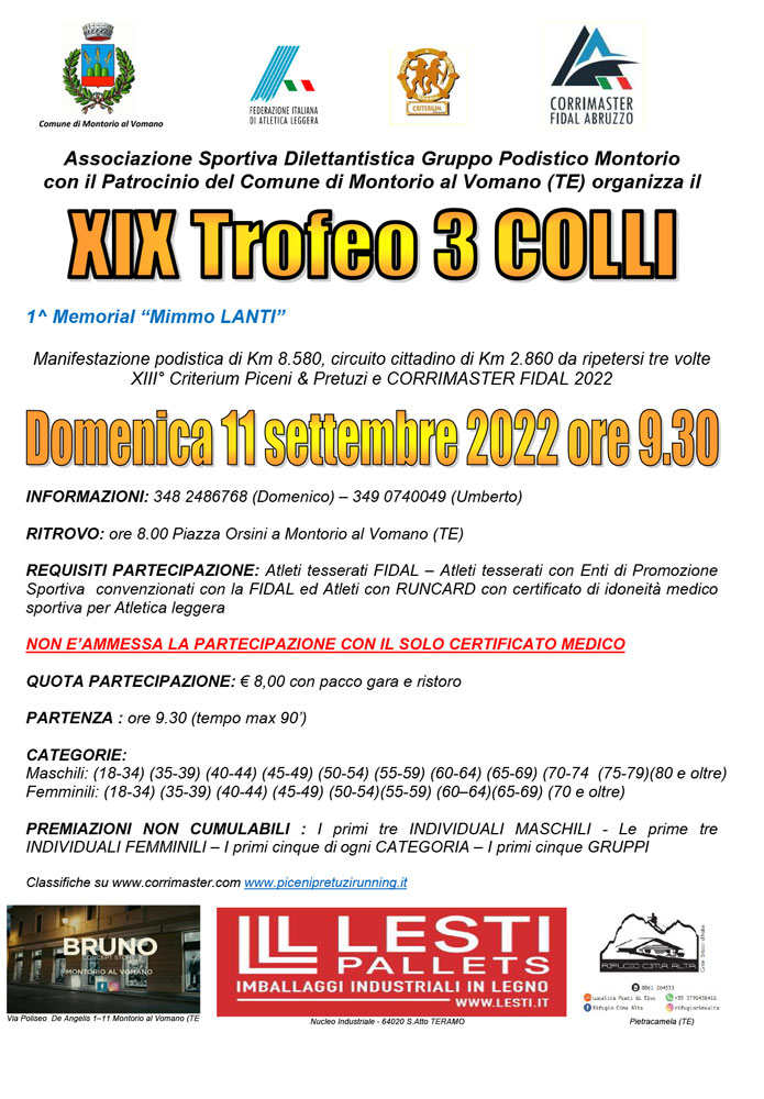 08 Settembre 2022Si corre domenica 11 settembre a Montorio al Vomano, in provincia di Teramo, la XIX edizione del Trofeo Tre Colli, 1° Memorial Mimmo Lanti, manifestazione podistica del Corrimaster che prevede una gara di Km 8,5. Tempo massimo di percorrenza: 90 minuti. L’evento è organizzato dal Gruppo Podistico Montorio. Ritrovo alle ore 8.00 in Piazza Orsini, partenza alle 9.30. La quota di partecipazione è di 8 €.