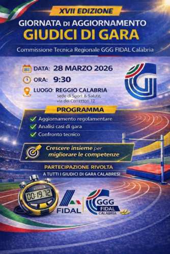 La Commissione Tecnica Regionale GGG FIDAL Calabria organizza la XVII edizione della Giornata di Aggiornamento, in programma sabato 28 marzo 2026 dalle ore 9:30 presso la sede di Sport & Salute di Reggio Calabria.